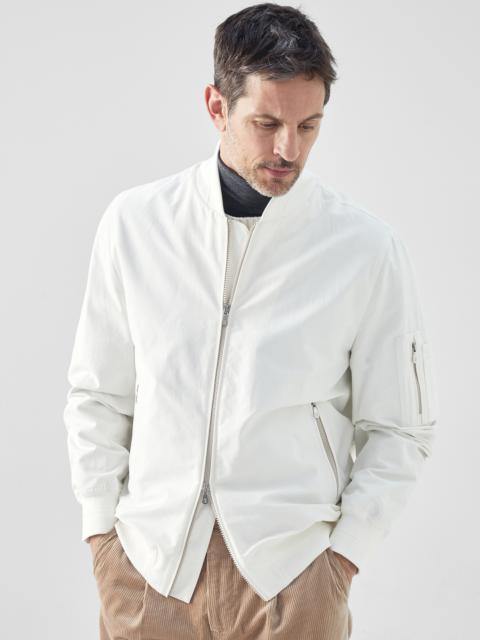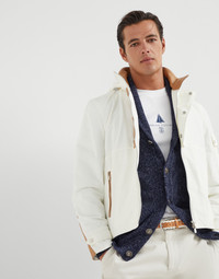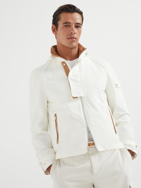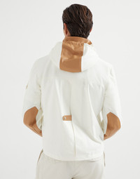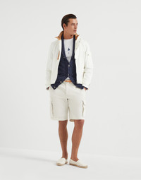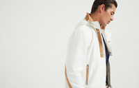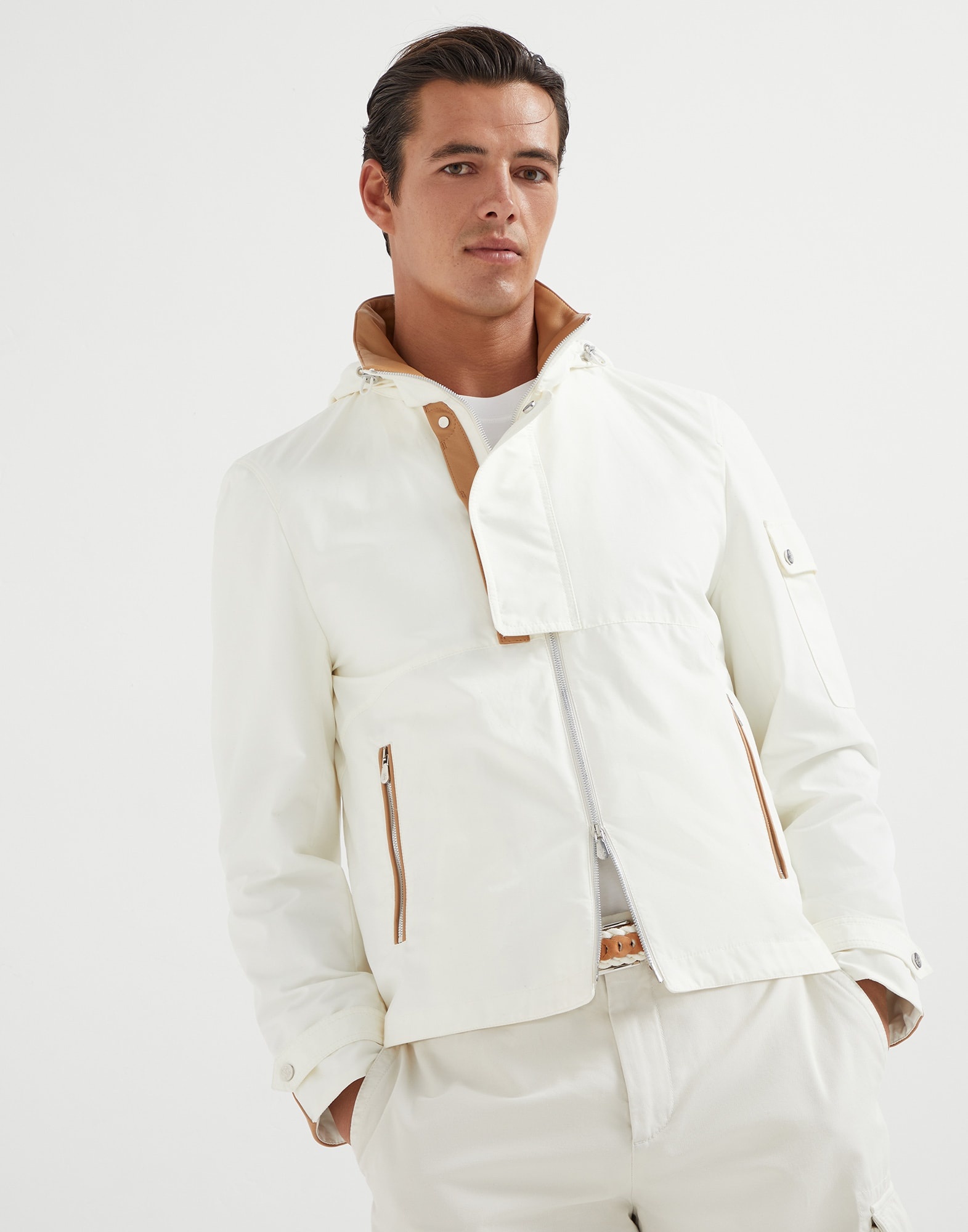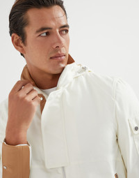 A refined mix of elegance and function, this gabardine jacket updates the classic look of outerwear with high-quality materials and introduces an element of sophisticated contrasts through the use of polished nappa. Techno cotton enhances the characteristics of the natural fiber, creating a compact, comfortable fabric that is perfect for everyday wear or while traveling. The silhouette is sporty and functional, with a detachable hood and zipper closure. MATERIALS The techno cotton gabardine uses twisted yarns that accentuate the fabric’s compact, comfortable and crisp texture, completed by a technical fiber component that provides water-resistant and wrinkle-free properties. The ultra-lightweight cupro lining ensures the garment’s comfort. DETAILS Double closure with zip and snaps Collar with insert Detachable drawcord hood with lining Hand pockets with zipper Pocket on sleeve Adjustable button cuffs Cupro lining Two interior pockets with button and pen holder Single back slit with buttons 67% COTTON, 33% NYLON