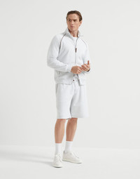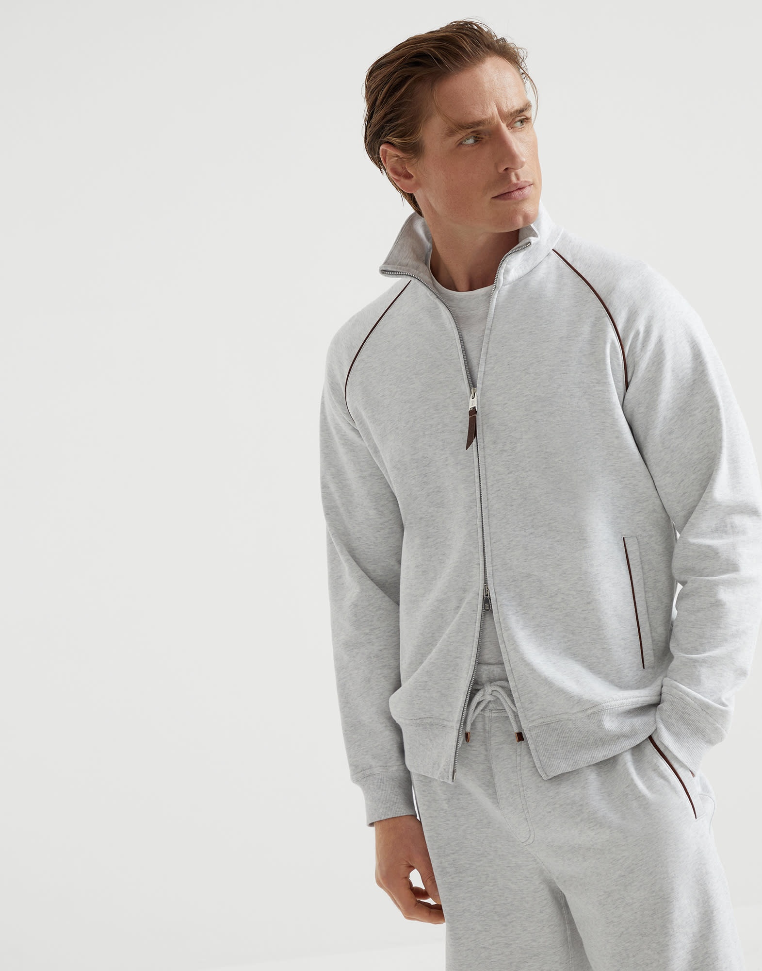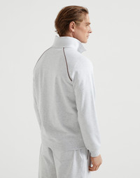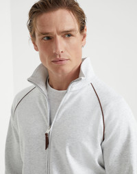 Refined materials enrich the sporty style of the Travelwear line, dedicated to moments of relaxation and leisure. Reminiscent of casual styles with a soft, relaxed silhouette, this high-neck sweatshirt is completed by the zipper closure and ribbed trim, and is delivered in techno cotton French terry with its distinctive texture contrast: smooth and compact on the outside and soft on the inside against the skin. The garment is defined by the contrasting inserts on the raglan sleeves. MATERIALS Techno cotton French terry is a soft and lightweight fabric: the exterior texture is smooth and compact, while the interior offers a honeycomb structure which helps to make it comfortable when worn. A small percentage of synthetic fiber provides added comfort. DETAILS Two-way zip closure Stand-up collar Raglan sleeve Hand pockets Rib knit cuffs and bottom band 95% COTTON, 5% NYLON