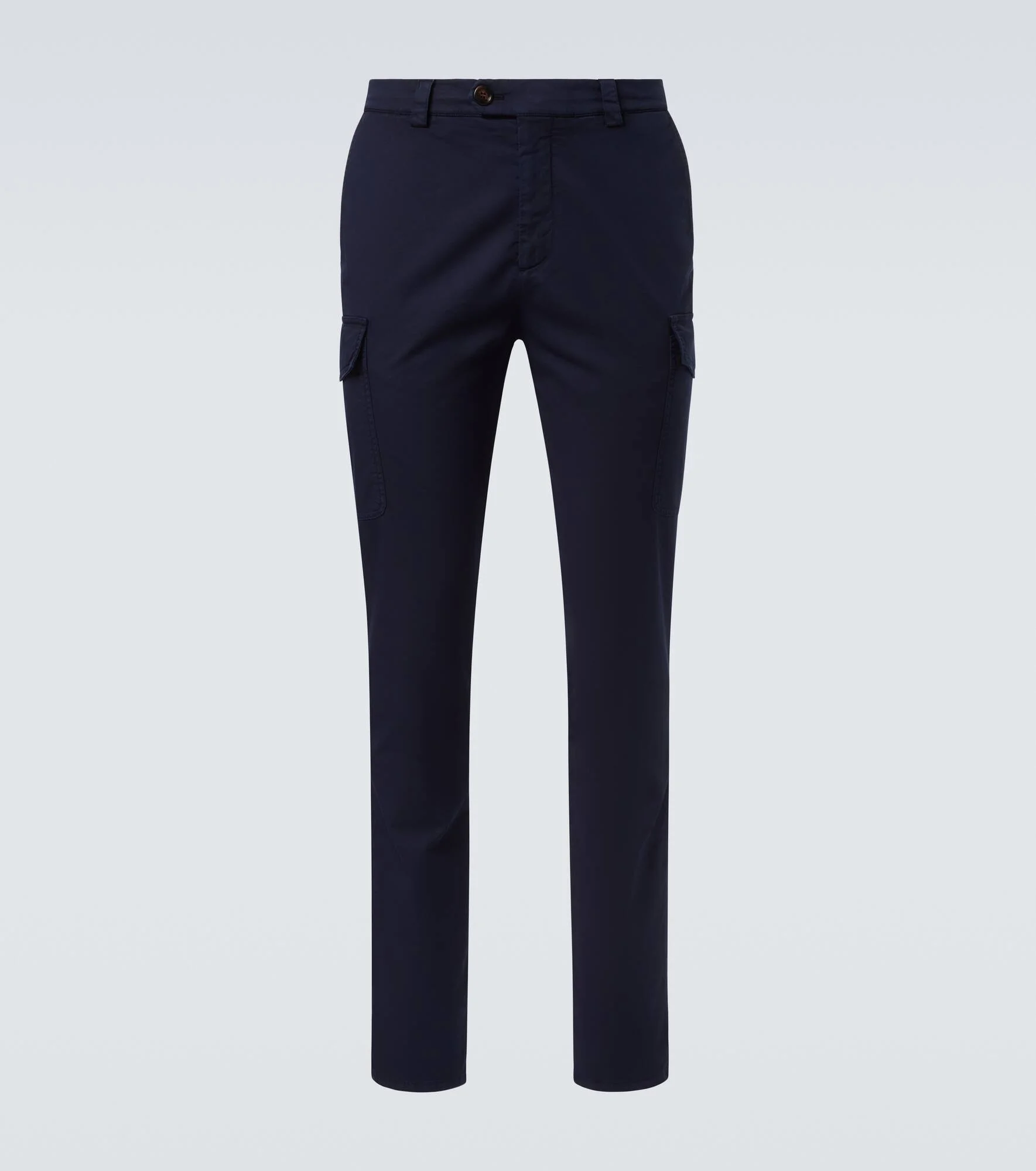 Brunello Cucinelli's designs are created in Solomeo, a medieval hamlet whose art and traditions are woven into the house's every fiber. Crafted from a soft cotton blend, these slim pants feature a sleek silhouette with cargo pockets at the sides. Product Details - Material: 97% cotton, 3% elastane - Care instructions: dry clean - Made in Italy - Designer color name: C2517 - Item color: blue - Lining: 100% cotton - Lining II: 58% cotton, 42% polyester - Pockets: cargo pockets, back pockets, side slit pockets - Belt loops - Closure: zipper fly, button and hook fastenings - Contains non-textile parts of animal origin - Item number: P01056062 Size & Fit - True to size - Non-stretchy fabric - Slim-leg - Height of model is 189cm-74.5" and wears a size 50