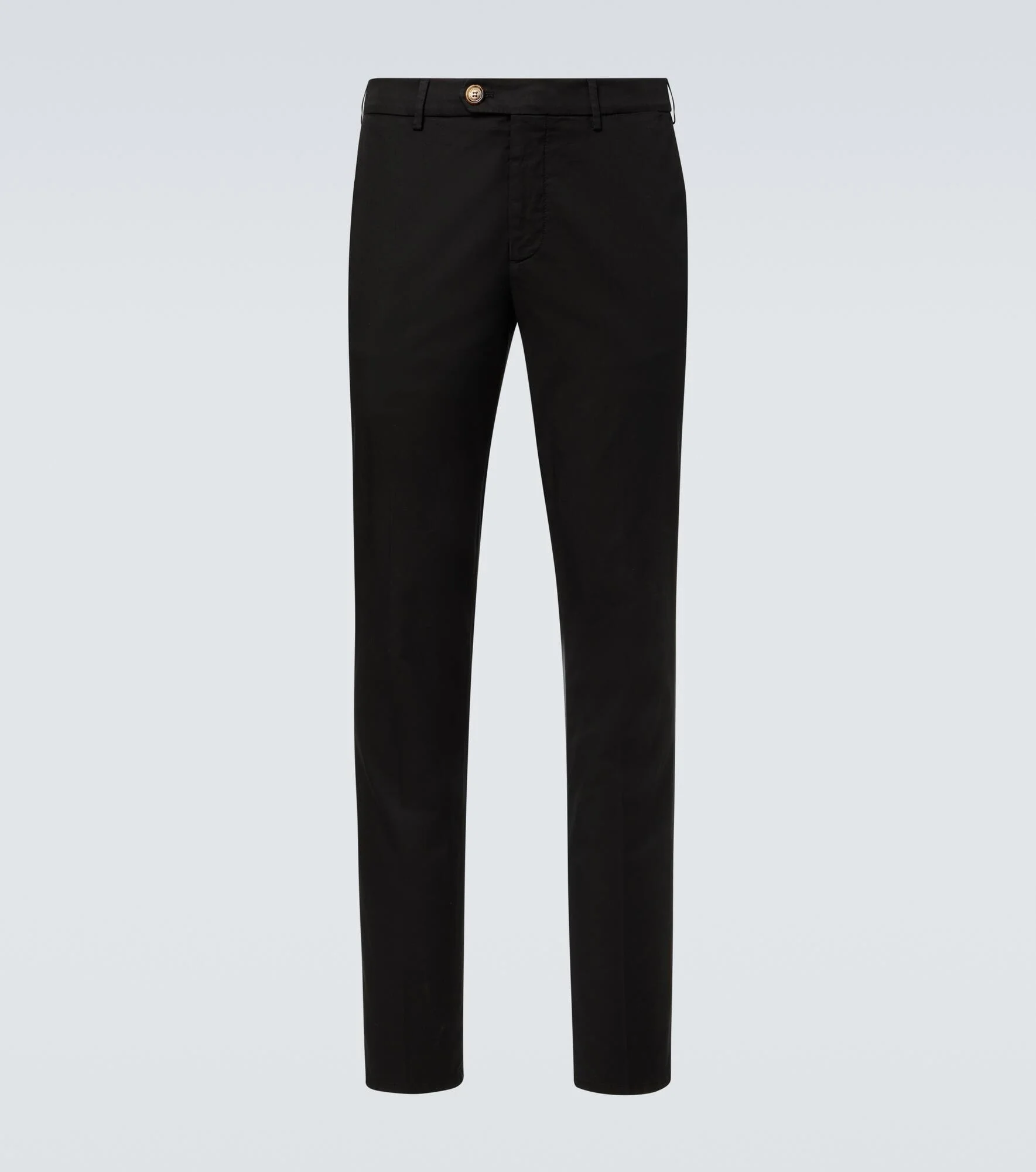 Add casual refinement to your warm-weather edit with these Brunello Cucinelli pants. Crafted from a lightweight cotton blend, the pair is cut to a slim silhouette with front creases and a button fastening. Product Details - Material: 97% cotton, 3% elastane - Care instructions: machine wash at 30 degrees - Made in Italy - Designer color name: Nero - Item color: black - Lining: 100% cotton - Lining II: 58% cotton, 42% polyester - Belt loops - Pockets: side slit pockets, back pockets - Closure: zip and button fastening - Item number: P01138493 Size & Fit - True to size - Non-stretchy fabric - Slim-leg - The model in the picture is 185cm-6'1" and wearing a size 50