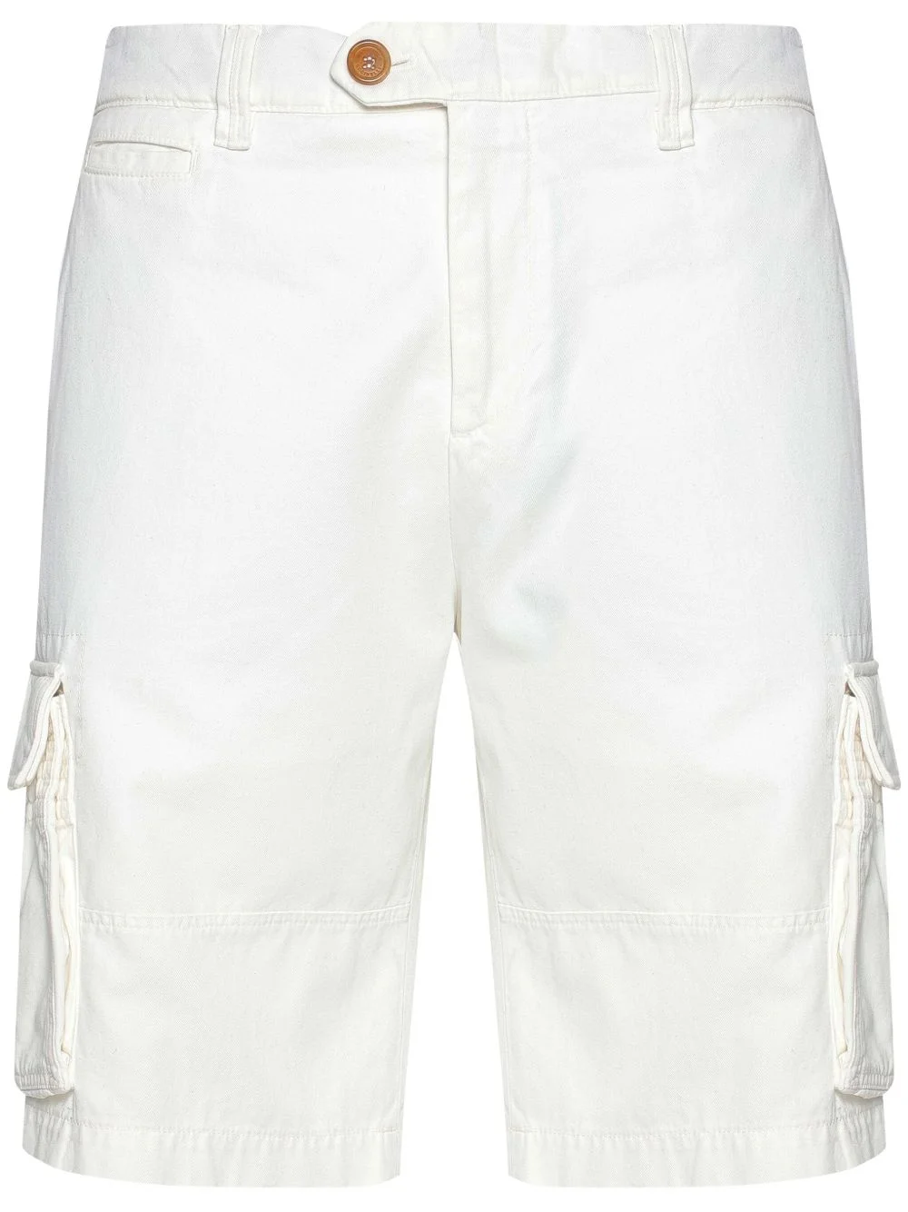 cotton cargo shorts Highlights - White - Cotton - Twill weave - Concealed fly and button fastening - Mid-rise - Belt loops - Two side slit pockets - Two side cargo pockets - Two rear flap pockets - Straight leg - Knee-length Made in Italy Composition Cotton 100% Washing instructions Read Manufacturer Guidelines