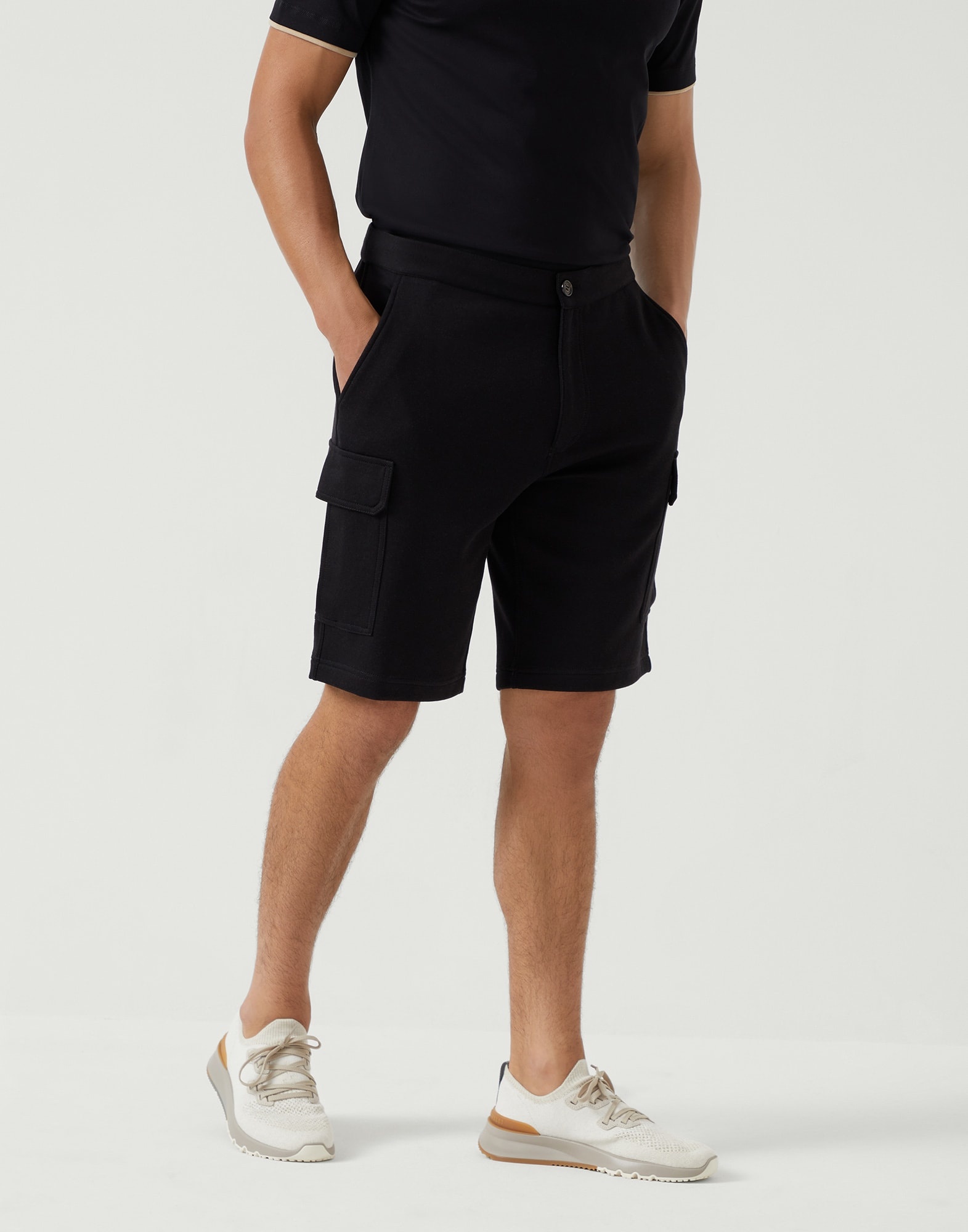 A careful selection of refined materials elevates the casual feel of these cotton, cashmere and silk Bermuda shorts from the Travelwear line, dedicated to relaxation and leisure. The soft, warm double French terry fabric provides the garment with extreme comfort, completed by the drawstring waist and side cargo pockets. The fit offers regular proportions in the hips and down the leg. MATERIALS Double French terry uses natural cotton, cashmere and silk fibers to provide warmth, softness and protection. The presence of elastic fibers helps to perfect its comfort. DETAILS Zip closure with button and drawstring Slanted front pockets Cargo pockets with flap and buttons Back patch pockets with flap and buttons Plain hem 65% COTTON, 24% NYLON, 7% CASHMERE, 4% SILK