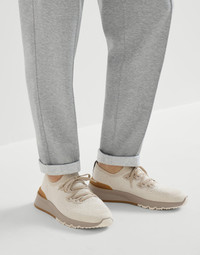 The classic yarns of Brunello Cucinelli knitwear inspire the elegant, sporty feel of these sneakers. The upper is made of a very lightweight, stretch chine knit, which showcases a compact appearance on the sides with "micro-perforations" on the toe, a detail characteristic of sporty accessories. The elasticity of the knit guarantees an optimal fit and comfort. MATERIALS The cotton knit combines natural and synthetic fibers as well as a small percentage of spandex to provide optimal comfort. Its unlined construction and EVA bottom offer lightness. DETAILS Flat fabric laces Unlined Sole in lightweight micro rubber Detachable insole 89% COTTON, 10% NYLON, 1% ELASTANE