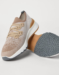 The classic yarns of Brunello Cucinelli knitwear inspire the elegant, sporty feel of these sneakers. The upper is made of a very lightweight, stretch chine knit, which showcases a compact appearance on the sides with "micro-perforations" on the toe, a detail characteristic of sporty accessories. The elasticity of the knit guarantees an optimal fit and comfort. MATERIALS The cotton knit combines natural and synthetic fibers as well as a small percentage of spandex to provide optimal comfort. Its unlined construction and EVA bottom offer lightness. DETAILS Flat fabric laces Unlined Sole in lightweight micro rubber Detachable insole 89% COTTON, 10% NYLON, 1% ELASTANE