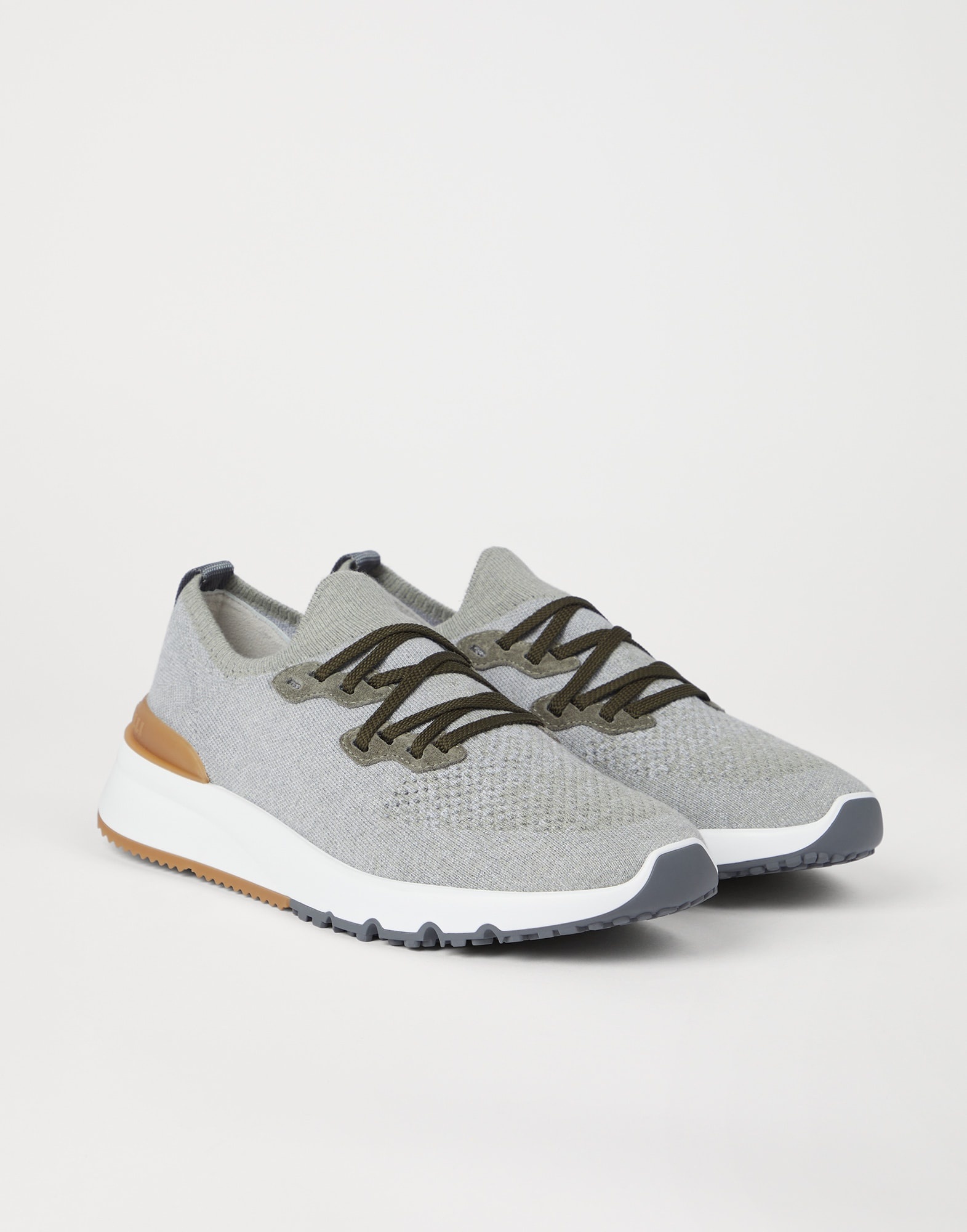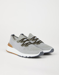 The classic yarns of Brunello Cucinelli knitwear inspire the elegant, sporty feel of these sneakers. The upper is made of a very lightweight, stretch chine knit, which showcases a compact appearance on the sides with "micro-perforations" on the toe, a detail characteristic of sporty accessories. The elasticity of the knit guarantees an optimal fit and comfort. MATERIALS The cotton knit combines natural and synthetic fibers as well as a small percentage of spandex to provide optimal comfort. Its unlined construction and EVA bottom offer lightness. DETAILS Flat fabric laces Unlined Sole in lightweight micro rubber Detachable insole 89% COTTON, 10% NYLON, 1% ELASTANE