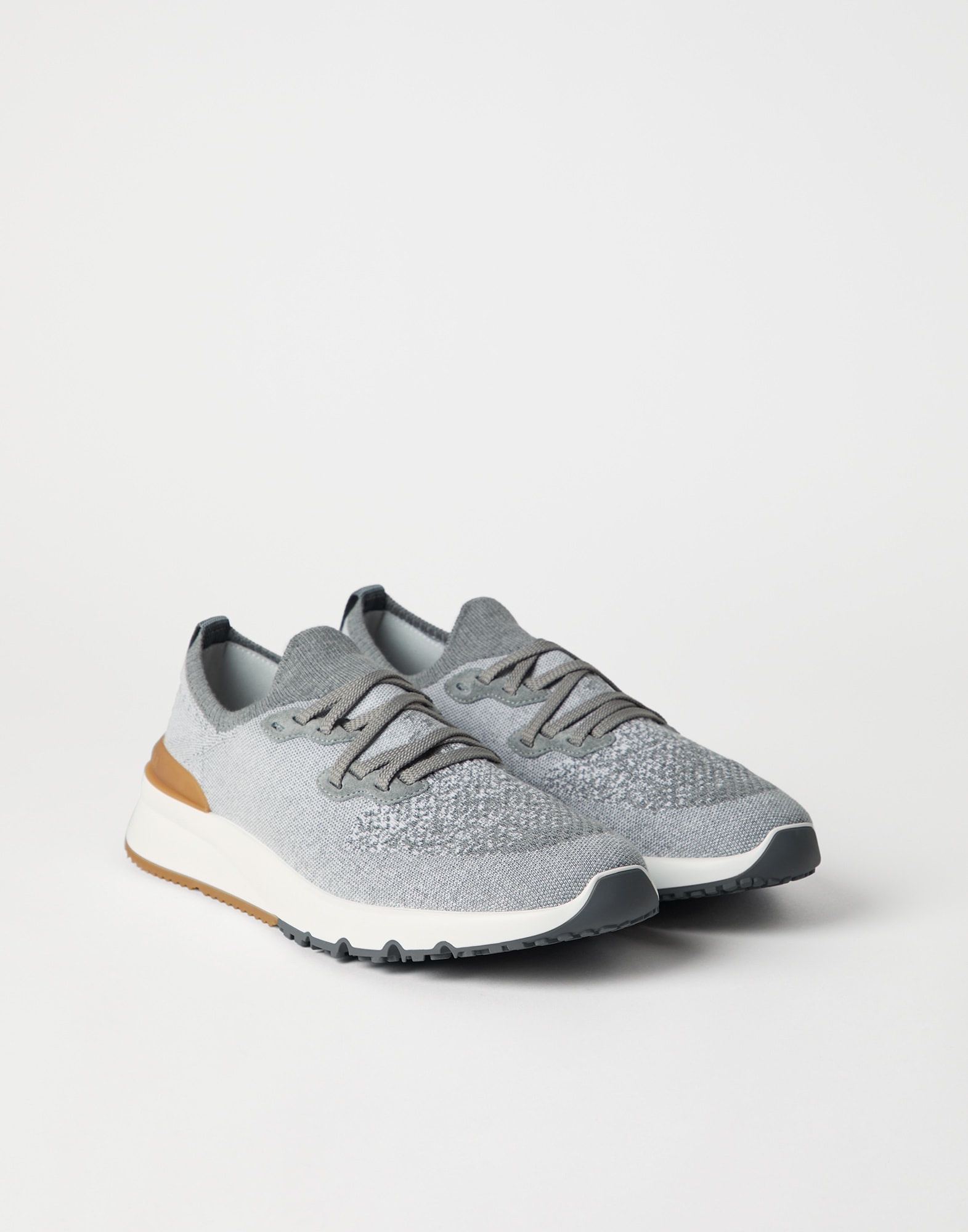 The classic yarns of Brunello Cucinelli knitwear inspire the elegant, sporty feel of these sneakers. The upper is made of a very lightweight, stretch chine knit, which showcases a compact appearance on the sides with "micro-perforations" on the toe, a detail characteristic of sporty accessories. The elasticity of the knit guarantees an optimal fit and comfort. MATERIALS The cotton knit combines natural and synthetic fibers as well as a small percentage of spandex to provide optimal comfort. Its unlined construction and EVA bottom offer lightness. DETAILS Flat fabric laces Unlined Sole in lightweight micro rubber Detachable insole 89% COTTON, 10% NYLON, 1% ELASTANE