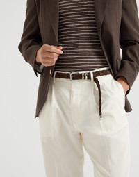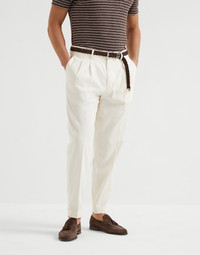 The timeless feel of tailoring is paired with the excellence of Brunello Cucinelli materials and workmanship in these leisure fit cotton crepe twill trousers. The diagonal weave of the yarn gives the fabric an air of sophisticated elegance, pairing perfectly with details such as the double pleats on the front. The leisure fit offers soft proportions in the seat and rise, while the cut of the leg remains close to the body. MATERIALS The diagonal weave of twill gives the cotton crepe fabric a compact feel and an elegant, fluid appearance, while the crisp texture takes on a softer consistency. DETAILS Zip closure with button, metal hook and backing button Slanted front pockets Double pleat Back welt pockets Cuffed hem Leisure fit: the rise and seat are soft and the proportions of the leg are tapered 100% COTTON
