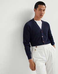 The timeless workmanship of Brunello Cucinelli knitwear elevates the essential silhouette of this pure cotton cardigan. The refined natural yarn comes to life thanks to the particular texture of the English rib knitting, which enhances its softness and comfort. The garment’s casual feel is defined by the button closure and raglan sleeves. MATERIALS Manufacturing of the pure cotton yarn enhances the qualities of the natural fibers and makes the garment lightweight and comfortable to wear. DETAILS Button closure Rib knit V-neck Raglan sleeve Vertical hand pockets Rib knit cuffs and bottom band English rib 100% COTTON