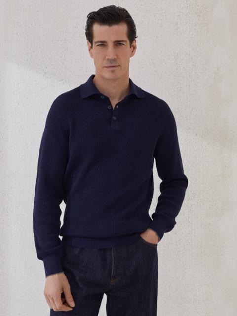 Brunello Cucinelli’s refined natural yarns elevate the essential, casual feel of this cotton long sleeve polo. The signature collar and raglan sleeves are paired with the classic English rib knit texture to give a traditional allure to the sporty silhouette. The fit offers regular, comfortable proportions. MATERIALS Manufacturing of the pure cotton yarn enhances the qualities of the natural fibers and makes the garment lightweight and comfortable to wear. DETAILS Shirt-style collar with button opening Raglan sleeve English rib 100% COTTON