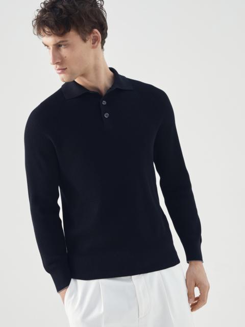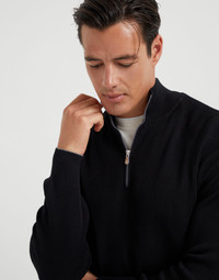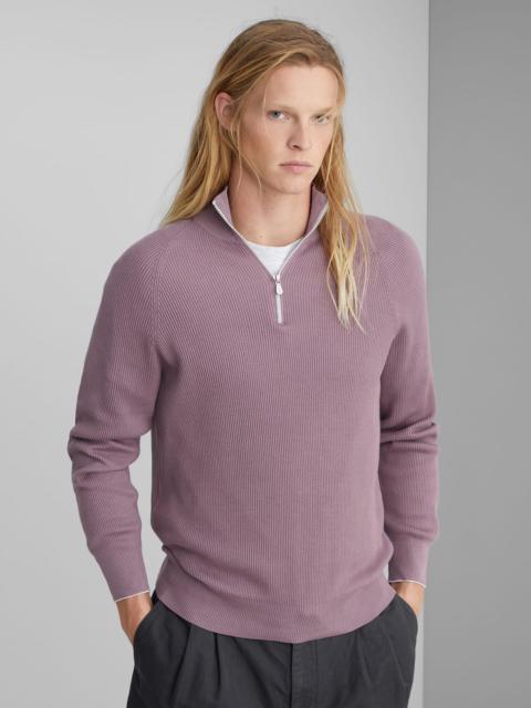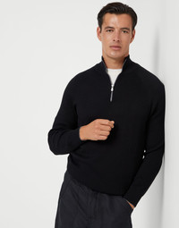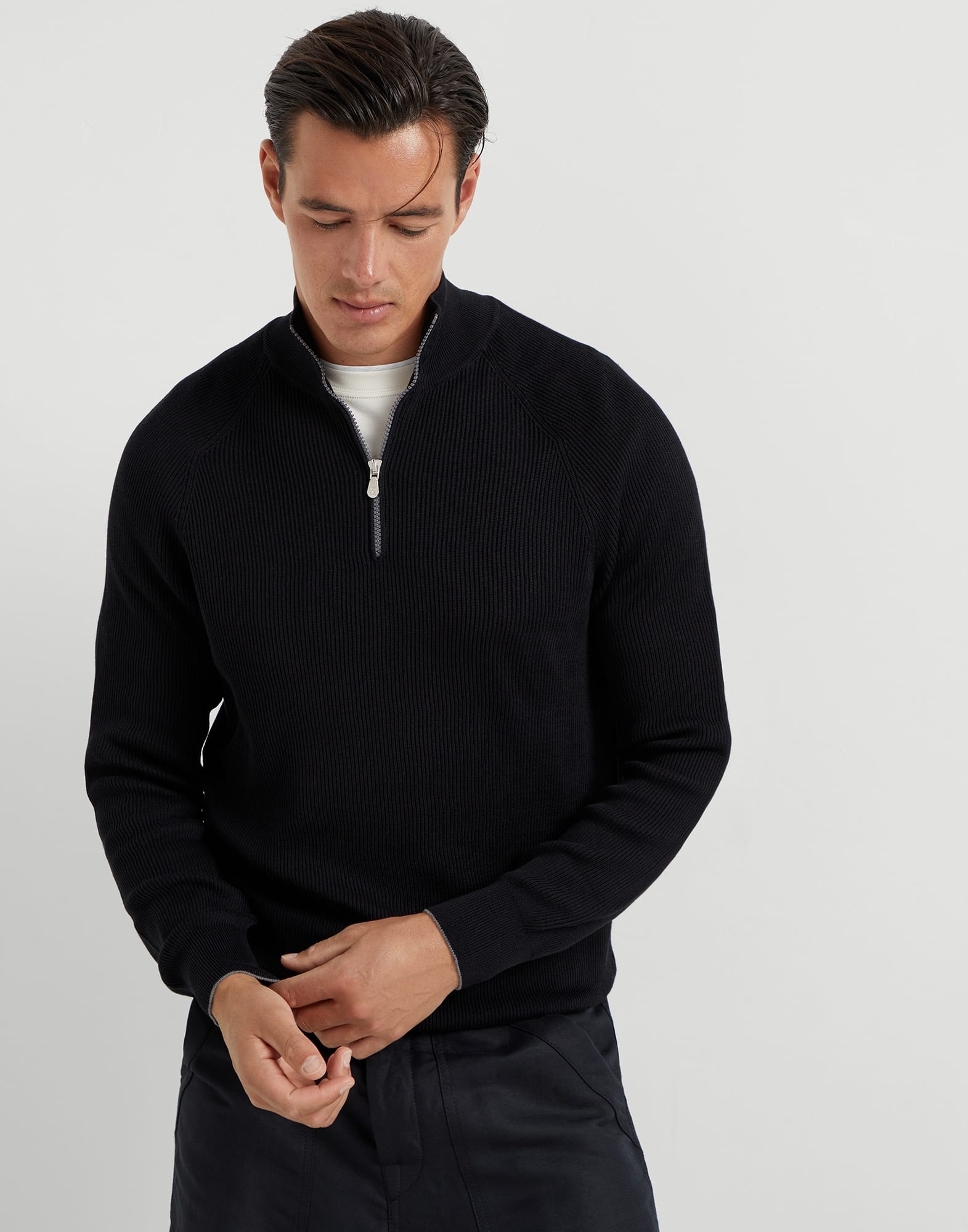 The classic, casual feel of English rib knitting is paired with the sporty details of the zipper closure and raglan sleeves in this pure cotton sweater. Lightweight and comfortable, the piece is ideal to wear in the summer. The silhouette features regular proportions. MATERIALS Manufacturing of the pure cotton yarn enhances the qualities of the natural fibers and makes the garment lightweight and comfortable to wear. DETAILS Zip opening High collar Raglan sleeve Rib knit cuffs and bottom band 100% COTTON