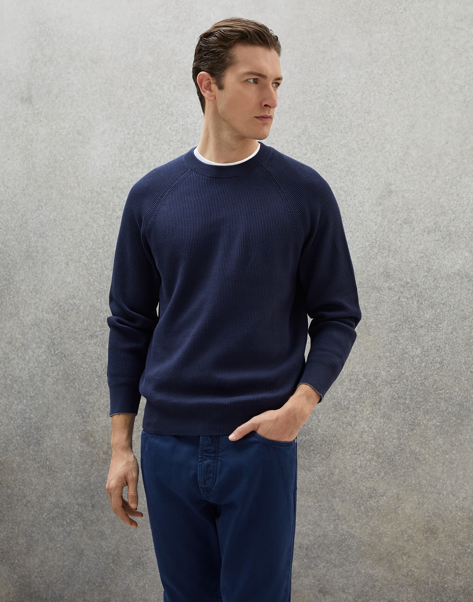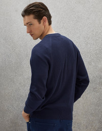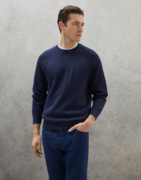 The traditional English Rib is combined with the sporty touch of raglan sleeves to characterize the style of the pure cotton sweater. Rib knit edges and the contrast color trim on the cuffs complete the garment, which offers a regular fit both in the chest and shoulders. MATERIALS Manufacturing of the pure cotton yarn enhances the qualities of the natural fibers and makes the garment lightweight and comfortable to wear. DETAILS Crew-neck in rib knit Raglan sleeve Rib knit cuffs and bottom band English rib 100% COTTON