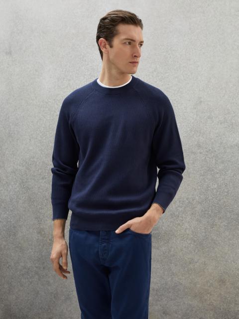 The traditional English Rib is combined with the sporty touch of raglan sleeves to characterize the style of the pure cotton sweater. Rib knit edges and the contrast color trim on the cuffs complete the garment, which offers a regular fit both in the chest and shoulders. MATERIALS Manufacturing of the pure cotton yarn enhances the qualities of the natural fibers and makes the garment lightweight and comfortable to wear. DETAILS Crew-neck in rib knit Raglan sleeve Rib knit cuffs and bottom band English rib 100% COTTON