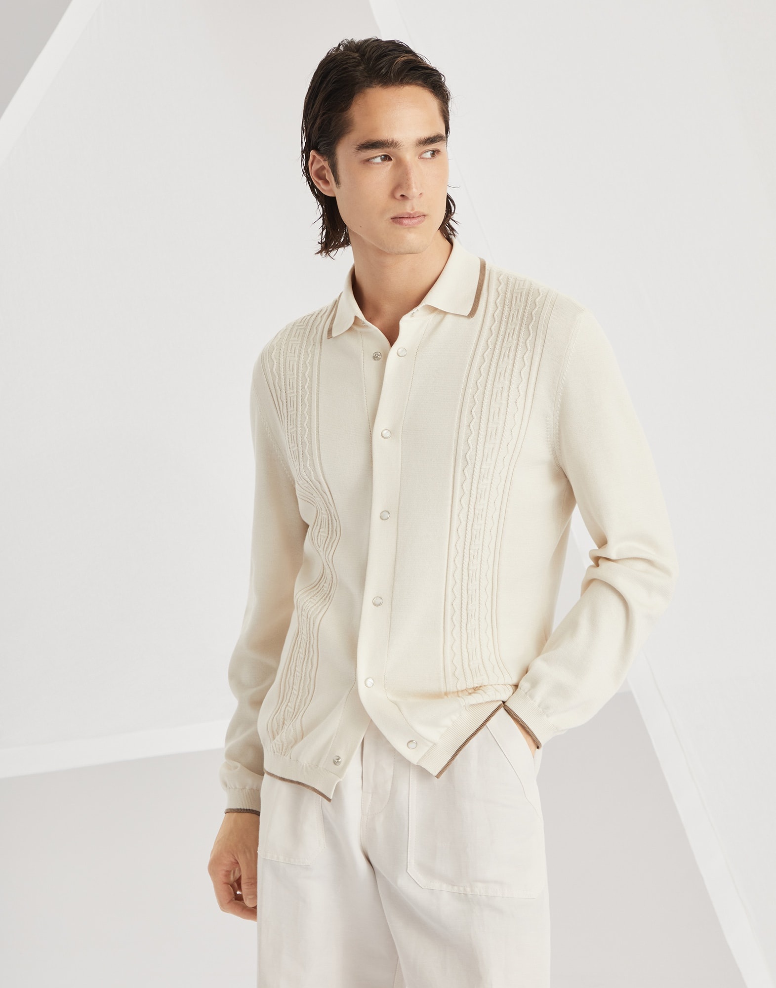 The refined yarns of Brunello Cucinelli knitwear enhance the classic silhouette of this shirt in a delicate balance of contrasts. The pure cotton garment is enriched with special jacquard knitting that creates a geometric texture with a slight three-dimensional effect. The fit offers regular proportions, completed by iconic details such as the contrasting trim on the collar and the button closure. MATERIALS Manufacturing of the pure cotton yarn enhances the qualities of the natural fibers and makes the garment lightweight and comfortable to wear. DETAILS Snap closure Shirt-style collar Regular shoulder Rib knit cuffs and bottom band Jacquard-knit 100% COTTON