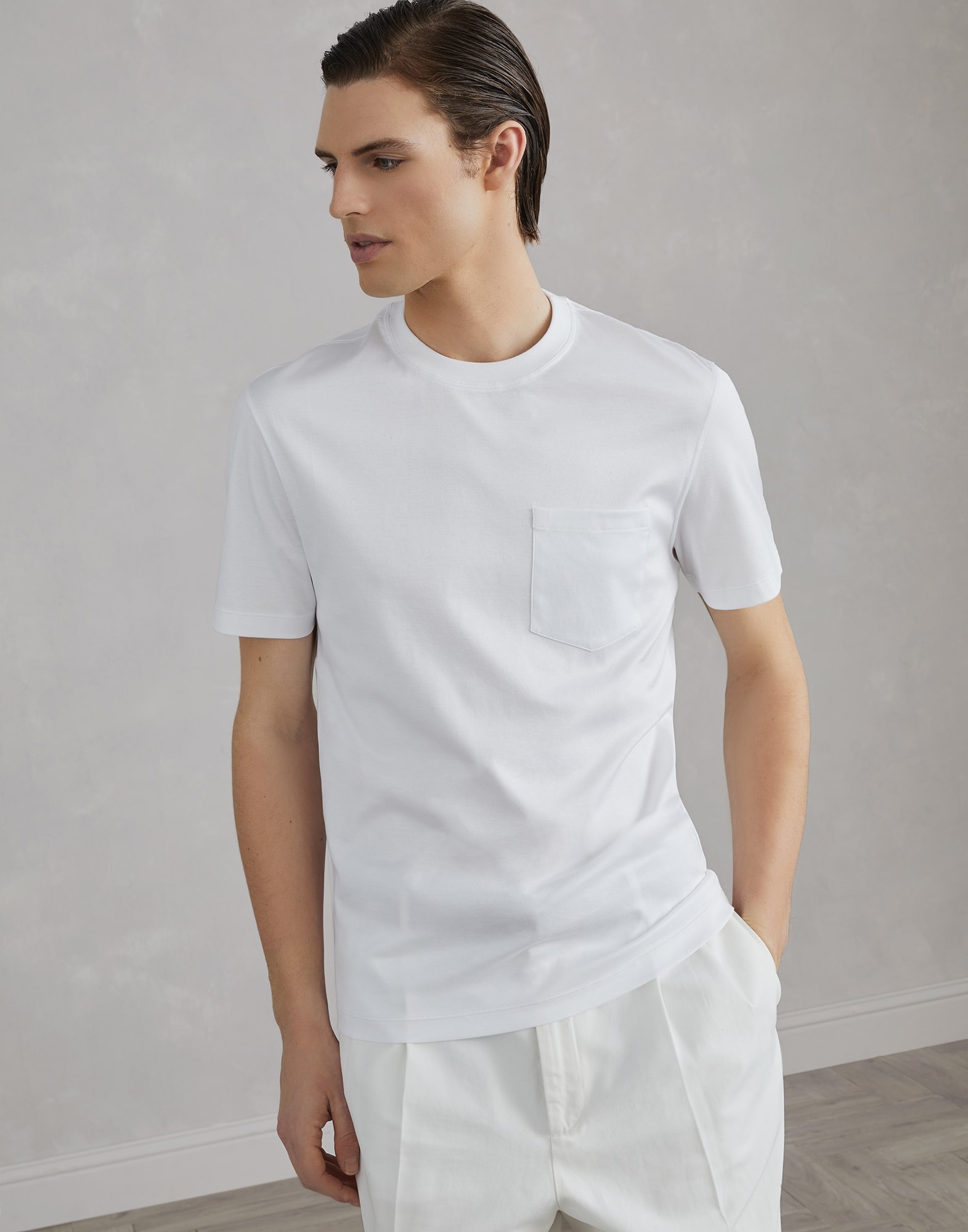 The quality of Brunello Cucinelli threads enriches this classic short sleeve T-shirt. Comfortable cotton jersey fabric is paired with the utility wear-inspired chest pocket detail. The regular fit and crew-neck complete the design. MATERIALS The exquisite quality of the natural cotton fibers enriches the soft jersey, a lightweight fabric with a smooth, fluid hand. DETAILS Crew-neck in rib knit Sleeves with flat pressed hem Flat pressed hem Chest pocket 100% COTTON