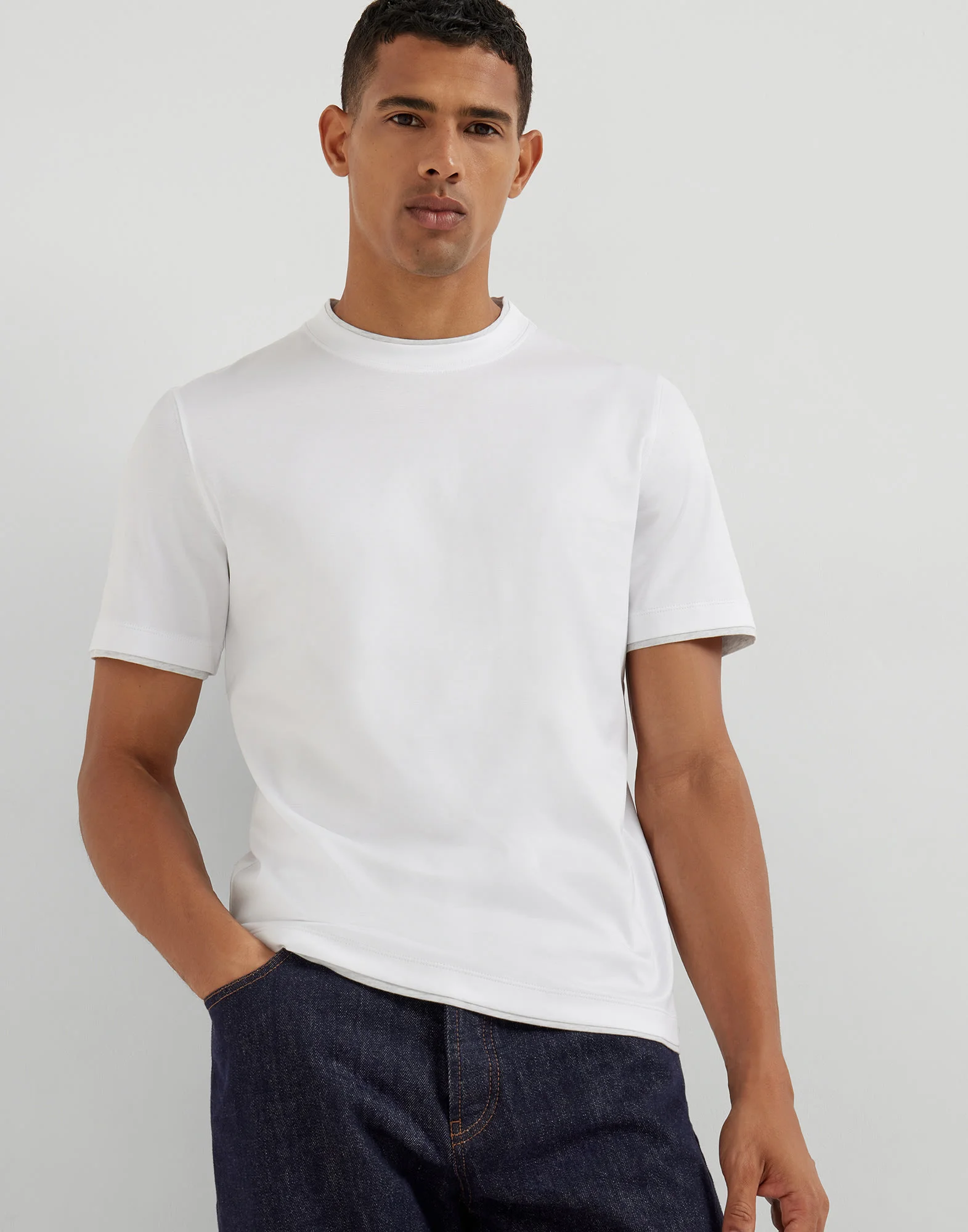 An elegant detail enhances this classic crew-neck T-shirt in soft cotton jersey. A contrast color insert creates a faux-layered effect that highlights the edges of the neckband, sleeves and bottom. The silhouette features regular proportions. MATERIALS Fine natural cotton fiber enriches the soft jersey, a lightweight fabric with a soft, fluid hand. DETAILS Crew-neck Sleeves with flat pressed hem Flat pressed hem Basic fit 100% COTTON