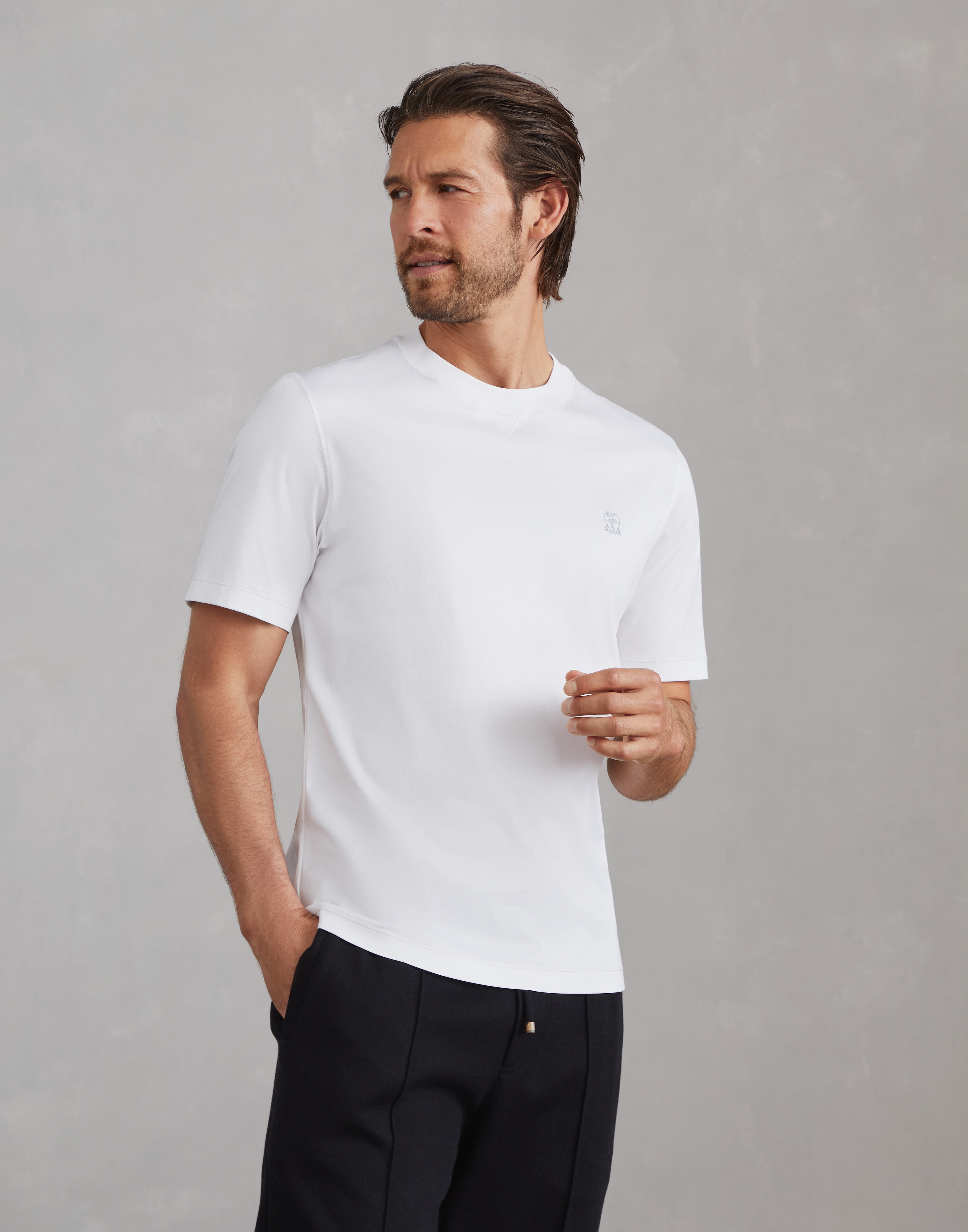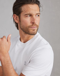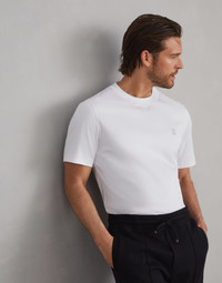 The excellence of Brunello Cucinelli materials enriches this classic logo T-shirt from the Travelwear line, dedicated to moments of relaxation and free time. Cotton jersey is combined with the Solomeo crest detail on the chest, which references the origins and values of the brand. The regular fit and crew-neck complete the design. MATERIALS The exquisite quality of the natural cotton fibers enriches the soft jersey, a lightweight fabric with a smooth, fluid hand. DETAILS Crew-neck with triangle Sleeves with flat pressed hem Flat pressed hem 100% COTTON