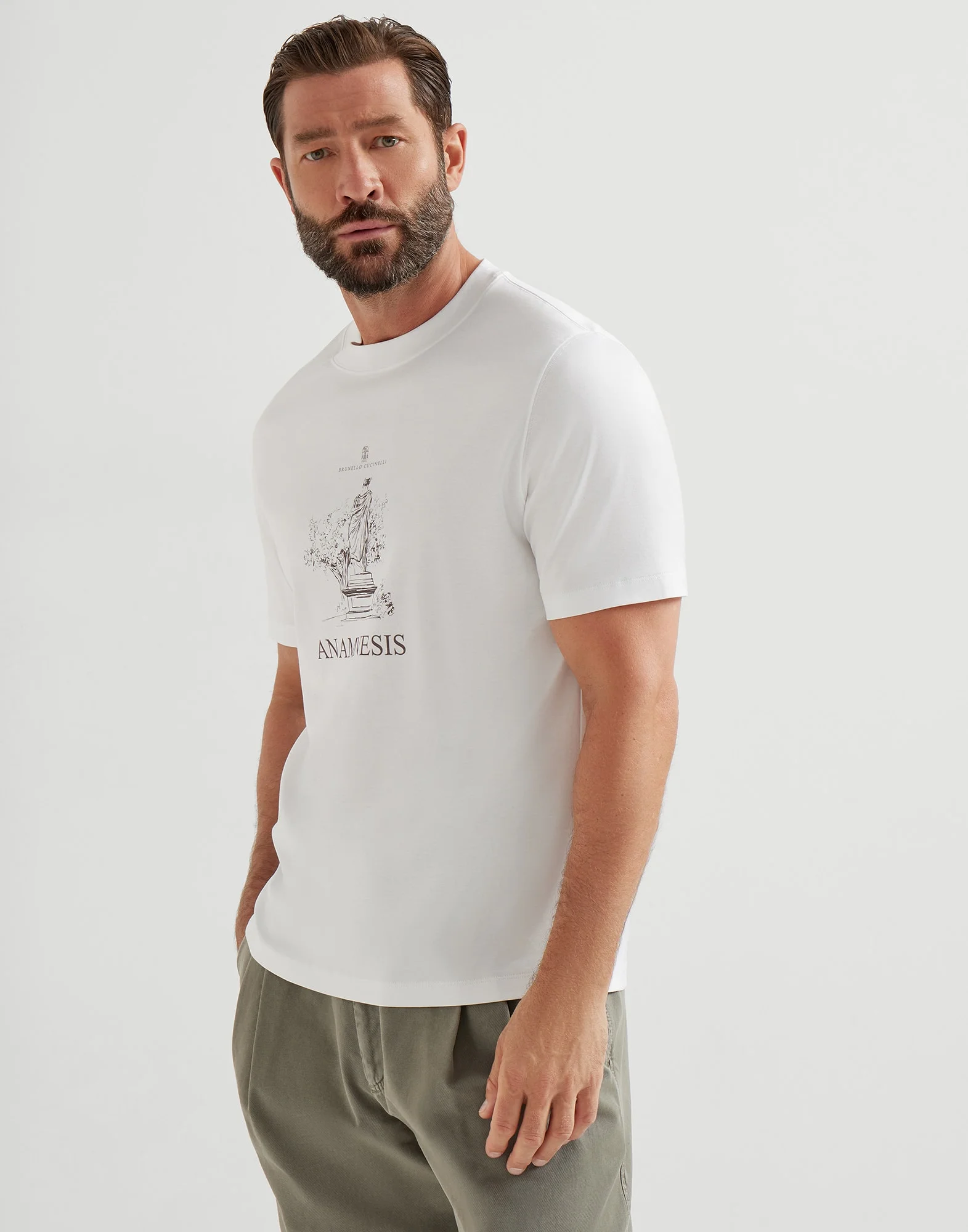 Creative inspiration and refined materials come together in the essential silhouette of this short sleeve crew-neck T-shirt. The pure cotton jersey’s smooth, compact texture is brought to life by the contrasting “Anamnesis” graphic, which references the value of reflection and knowledge. The garment showcases straight, comfortable lines. MATERIALS Fine natural cotton fiber enriches the soft jersey, a lightweight fabric with a soft, fluid hand. DETAILS Crew-neck Sleeves with flat pressed hem Flat pressed hem Regular fit 100% COTTON
