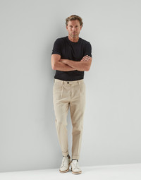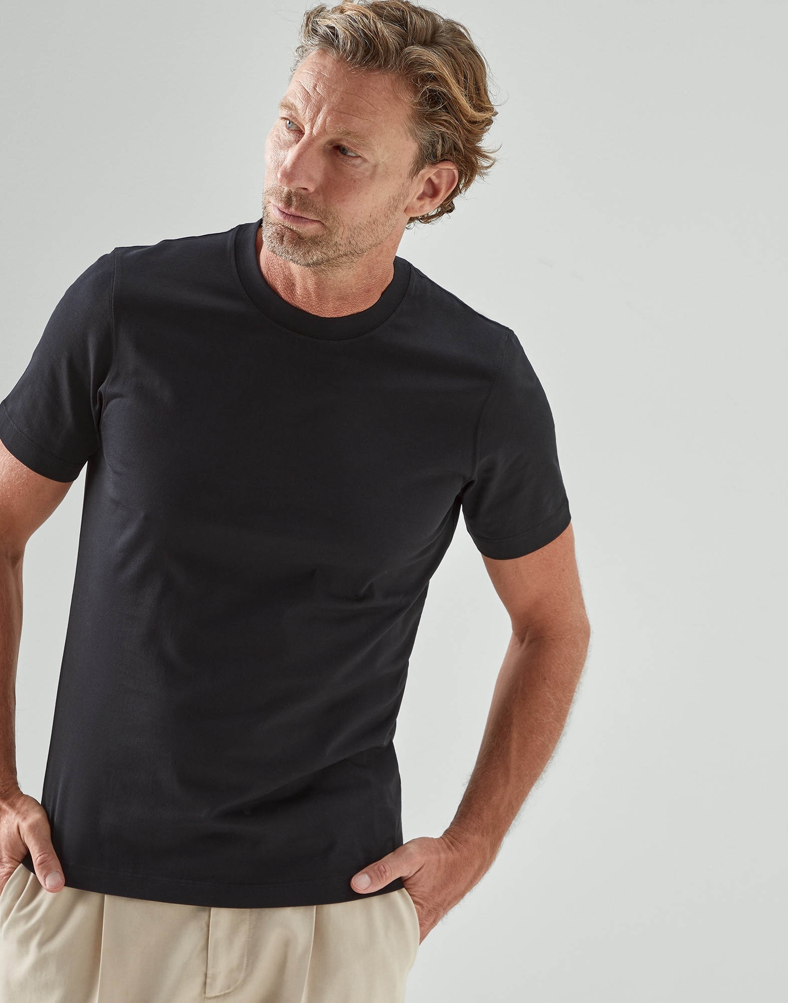 The crew-neck T-shirt, a year-round component of the male wardrobe, combines the qualities of lightweight cotton jersey with the form-fitting lines of a slim-fit, which remains close to the body both through the chest and shoulders. MATERIALS The exquisite quality of the natural cotton fibers enriches the soft jersey, a lightweight fabric with a smooth, fluid hand. DETAILS Crew-neck Flat pressed hem at cuffs and bottom Slim fit 100% COTTON