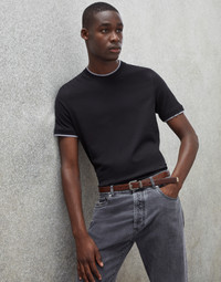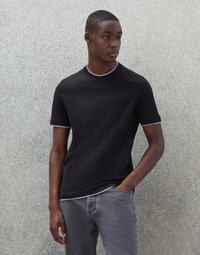 Cotton inserts add a color contrast to the base of the T-shirt and create a double-layer that embellishes the edges of the neckline, sleeves and bottom. The slim fit offers close, body-hugging wearability. MATERIALS The exquisite quality of the natural cotton fibers enriches the soft jersey, a lightweight fabric with a smooth, fluid hand. DETAILS Crew-neck Sleeves with flat pressed hem Flat pressed hem Slim fit 100% COTTON