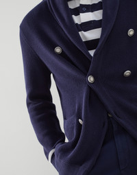 Nautical inspiration defines the style of this one-and-a-half-breasted cotton cardigan, characterized by its classic hand finished metal buttons. The contrast color edges of the cuffs, the shawl collar and the buttons on the shoulders complete the garment with distinct elements. Thanks to the lightness of the cotton and the comfortable proportions, the cardigan can also be worn as outerwear in the summer. MATERIALS The pure cotton yarn is woven with the Garza technique, a process which leaves wide stitches to make the garment lightweight and comfortable. DETAILS Metal button closure Shawl collar Horizontal hand pockets Rib knit cuffs and bottom band Half English rib 100% COTTON