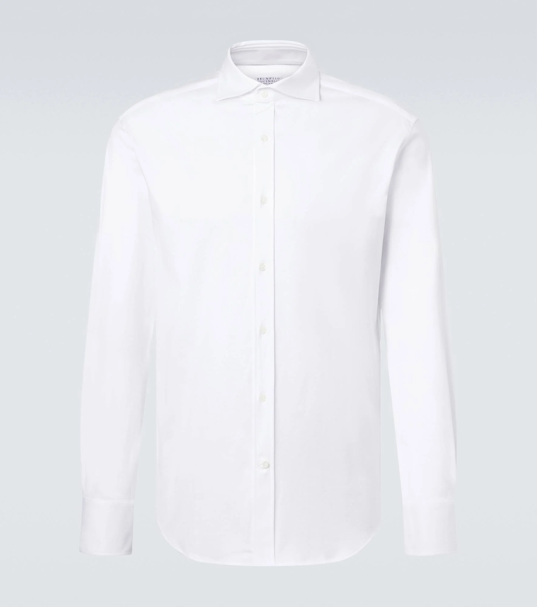The refined vision of Brunello Cucinelli is spotlighted by this shirt. Crafted from crisp cotton poplin, the piece features a classic collar and a buttoned front. Product Details - Material: 100% cotton - Care instructions: machine wash at 30 degrees - Made in Italy - Designer color name: Bianco - Item color: white - Contains non-textile parts of animal origin - Hem: rounded - Cuff: two buttons - Closure: buttoned front - Collar: classic (Straight point) - Sleeves: long-sleeved - Item number: P01138466 Size & Fit - True to size - Without pleats in the back - Classic fit - Stretchy fabric - Falls to the hip - The model in the picture is 185cm-6'1" and wearing a size L