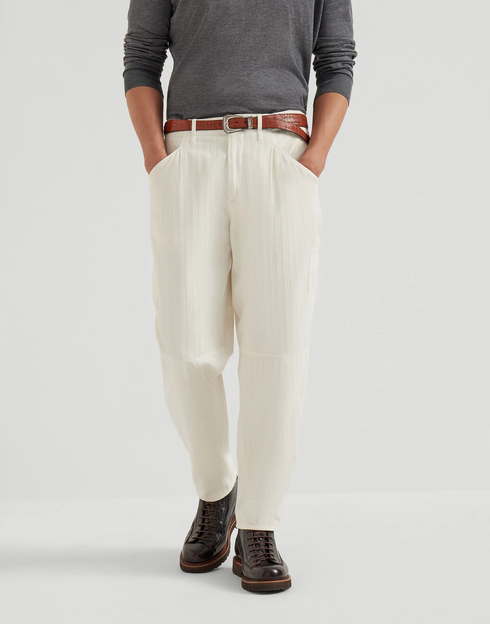 Modern and versatile, these ergonomic trousers redefine the masculine silhouette through clean, essential lines that follow the body's natural movements, ensuring everyday comfort. The chevron pattern evokes a tailored feel and enriches the compact, fluid hand of the pure, garment-dyed cotton, characterized by slightly irregular coloring that enhances the season's hues. The relaxed, balanced silhouette is completed by the patch pockets. MATERIALS The characteristic chevron texture is enriched by dyeing carried out on the finished garment, which gives the cotton fabric a “worn” look with slight color shading particularly visible along the edges and seams of the garment. DETAILS Zip closure with button Front pockets Pleat Side patch pockets Decorative faux pockets Plain hem 100% COTTON