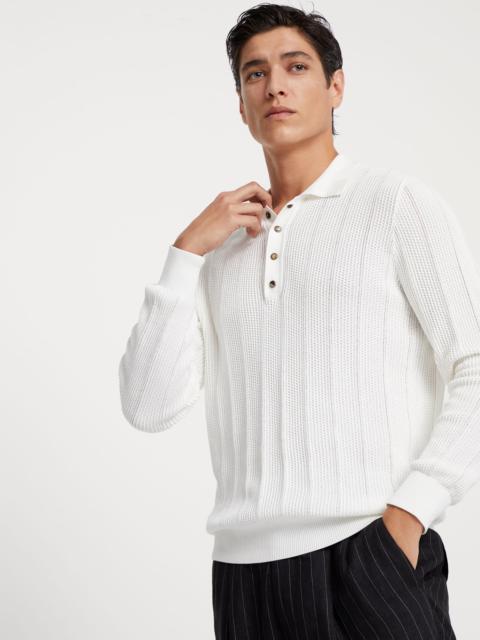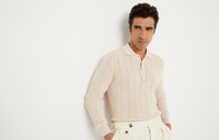 Traditional workmanship, modern comfort and refined details come together in this cotton knit polo shirt. The combination of the ribbed texture and shirting-inspired details elevate the casual style of the garment, characterized by a regular, comfortable fit. The horn snaps complete the piece with a sophisticated touch. MATERIALS Manufacturing of the pure cotton yarn enhances the qualities of the natural fibers and makes the garment lightweight and comfortable to wear. DETAILS Half-length opening with snaps Rib knit 100% COTTON