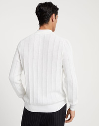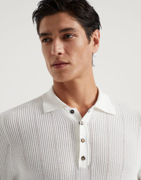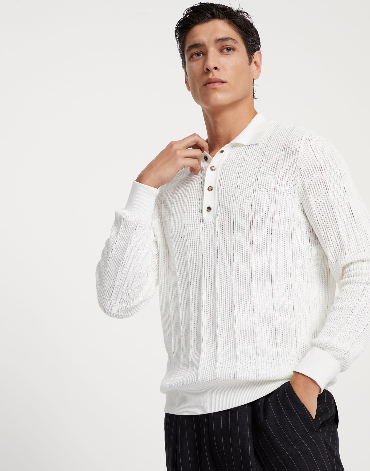 Traditional workmanship, modern comfort and refined details come together in this cotton knit polo shirt. The combination of the ribbed texture and shirting-inspired details elevate the casual style of the garment, characterized by a regular, comfortable fit. The horn snaps complete the piece with a sophisticated touch. MATERIALS Manufacturing of the pure cotton yarn enhances the qualities of the natural fibers and makes the garment lightweight and comfortable to wear. DETAILS Half-length opening with snaps Rib knit 100% COTTON
