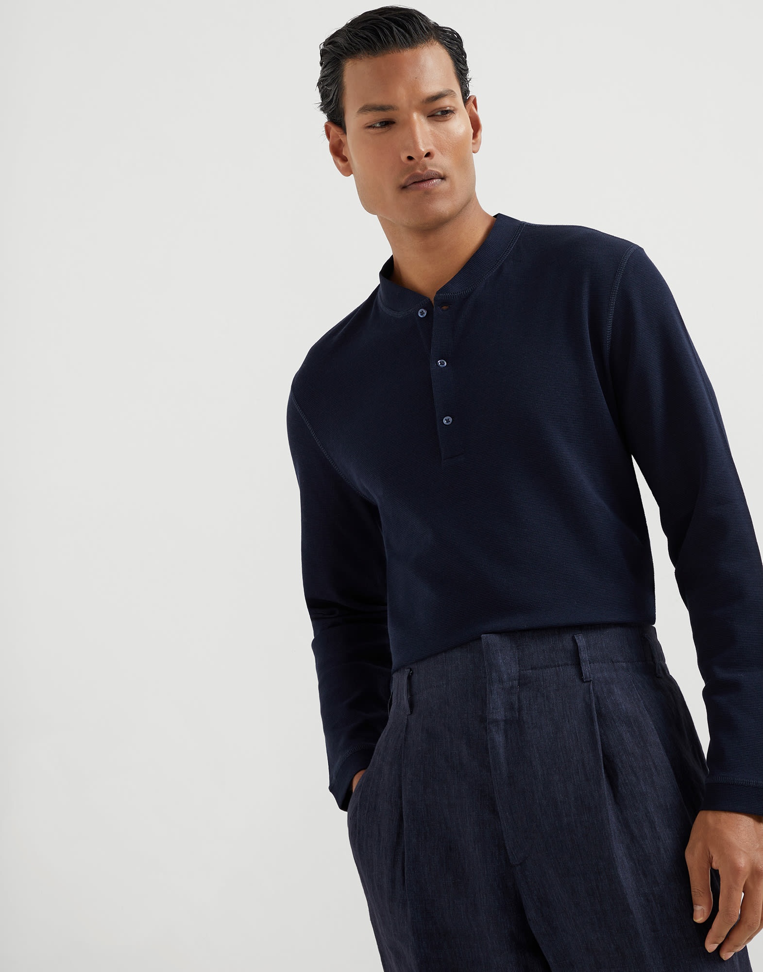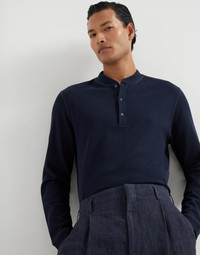 The mix of casual inspiration and refined materials defines the versatile, contemporary style of this long sleeve T-shirt with henley collar. Lightweight and smooth, the cotton and silk jersey is enriched with a distinct micro "waffle" texture. The fit offers regular, comfortable proportions. MATERIALS The lightweight jersey combines the properties of natural cotton and silk fibers, creating a fabric with a smooth, fluid hand, enhancing the season’s colors with a distinct sheen. The classic “Waffle” texture is updated in a micro version with a versatile, contemporary feel. DETAILS Henley collar Flat pressed hem at cuffs and bottom Special workmanship Regular fit 70% COTTON, 30% SILK