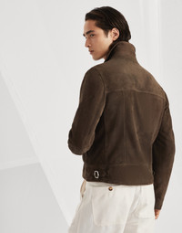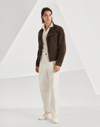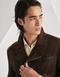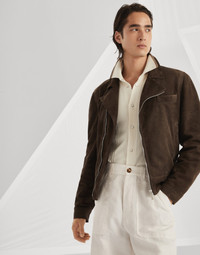 Refined Brunello Cucinelli materials and workmanship enrich the bold, casual style of this Country suede biker jacket. The leather’s particular finish highlights its natural qualities, creating a compact, velvety texture in a garment that remains lightweight and comfortable. The regular fit is completed by iconic details such as the angled zipper closure and lapel collar. MATERIALS Particularly fine and lightweight, Country suede features a sueded effect on both sides, making it perfect for unlined garments that maintain softness and structure. The cupro lining ensures optimal comfort. DETAILS Oblique two-way zip closure Shirt-style collar Chest pocket Hand pockets with zipper Buckles on the side Two interior pockets with zip closure Lined REAL LEATHER
