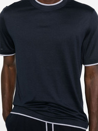 silk-blend T-shirt Highlights - Blue - Crew neck - Short sleeves - Straight hem - Contrasting border Made in Italy Composition Silk 62%, Cotton 38% SIZE & FIT Model measurements Height 6 ft 0 in(1.84 m) Bust/Chest 35.82 in(91 cm) Hips 37 in(94 cm) Waist 28.34 in(72 cm) FittingInformation Designed for a regular fit allowing for a comfortably loose fit throughout the body Made from a midweight non-stretch fabric, this piece offers minimal elasticity when worn