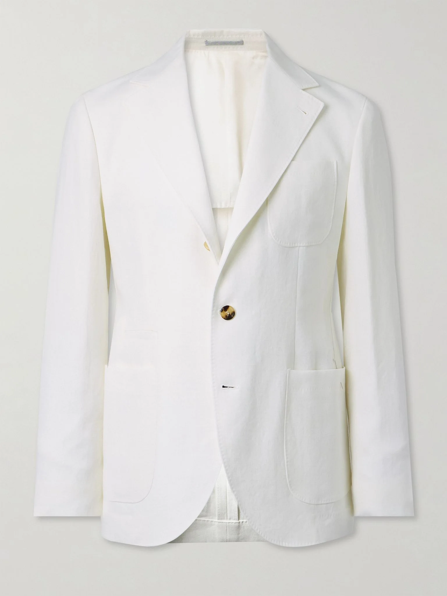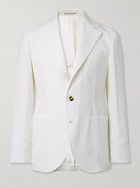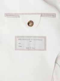 Brunello Cucinelli's blazer is stitched with a label inside for you to write your name and the date - a thoughtful detail that creates an heirloom quality. Partially lined for lightness, it's cut from breathable linen and fastens with natural horn buttons. Size & Fit - Those with broad shoulders may wish to take the next size up - Tailored for a regular fit - Mid-weight, non-stretchy fabric - Model is shown wearing an IT 50 - Model measures: chest 38"/ 96cm, height 6'1"/ 185cm Details & Care - White linen - Notch lapels, non-functioning buttoned cuffs, chest patch pocket, two front patch pockets, back vent, two internal buttoned pockets, partially lined - Three button fastening - 100% linen; buttons: 100% horn (Buffalo); lining: 100% cupro - Dry clean