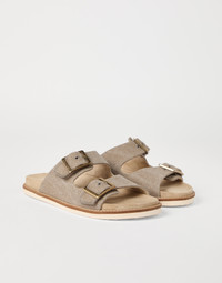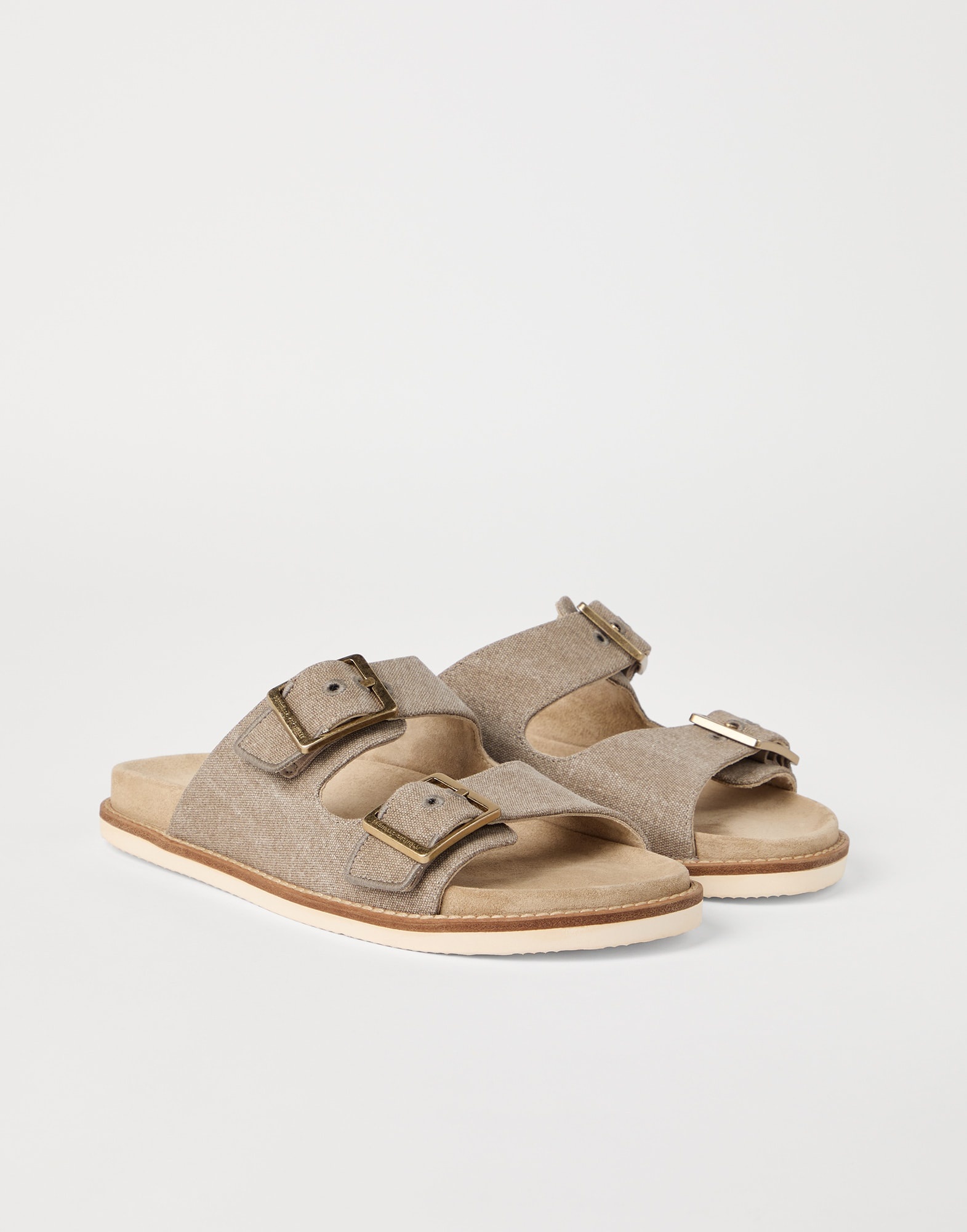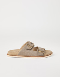 The excellence of Brunello Cucinelli materials enhances the informal style of these slide sandals, which are particularly versatile to pair with different looks and on warmer days. Detailed in delave canvas with a distinctive color effect, the upper bands with double metal buckles are combined with the smooth, velvety texture of suede, while the TPU outsole ensures a secure, comfortable fit. MATERIALS Delave canvas is a pure cotton fabric that is finished in a way that gives the color a slightly faded touch. It is combined with the velvety texture of suede and a lightweight rubber outsole, ensuring the footwear’s comfort. DETAILS Double monk strap closure Suede lining Rubber outsole TPU rubber tread 100% COTTON
