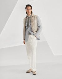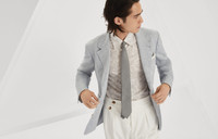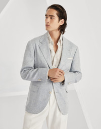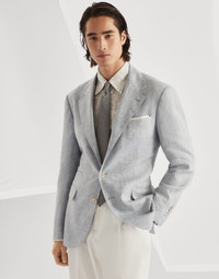 The unconstructed design of this blazer pairs perfectly with the light, summery look of delave linen, which enhances the season's colors with an irregular color effect. The “Solomeo Shoulder”, named after the hamlet where the company is located, characterizes the Brunello Cucinelli blazer with signature proportions. The tapered and pronounced cut of the shoulder enhances the male physique without the need for padding. MATERIALS Delave linen is a summer fabric with a light, rustic feel. The unmistakable slubbed texture and the delave finish enhance the season’s colors with a slightly uneven effect. DETAILS 3-roll-2 closure with metal buttons Notched lapel Welt pockets with flap, ticket pocket and chest pocket Cuffs have four metal buttons and functional buttonholes Double back vent Two interior pockets with button closure and pen holder Cupro half lining Drop 7 100% LINEN