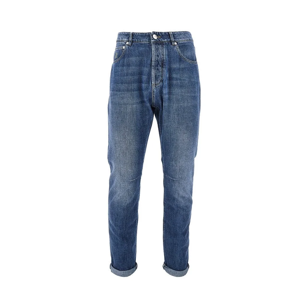 Five-pocket pants made from 9,5 OZ Japanese cotton denim, featuring slightly tapered cut. Regular waist with belt loops, buttons fly and button closure. Suede leather logo label at waist back and logo embroidery on the coin pocket. DETAILS Model code: M0Z37X1290 Color code: C1471 Season: SS26 Material: 100% CO Made in: Italy Sku: 30239 Color: Blue Brand: BRUNELLO CUCINELLI