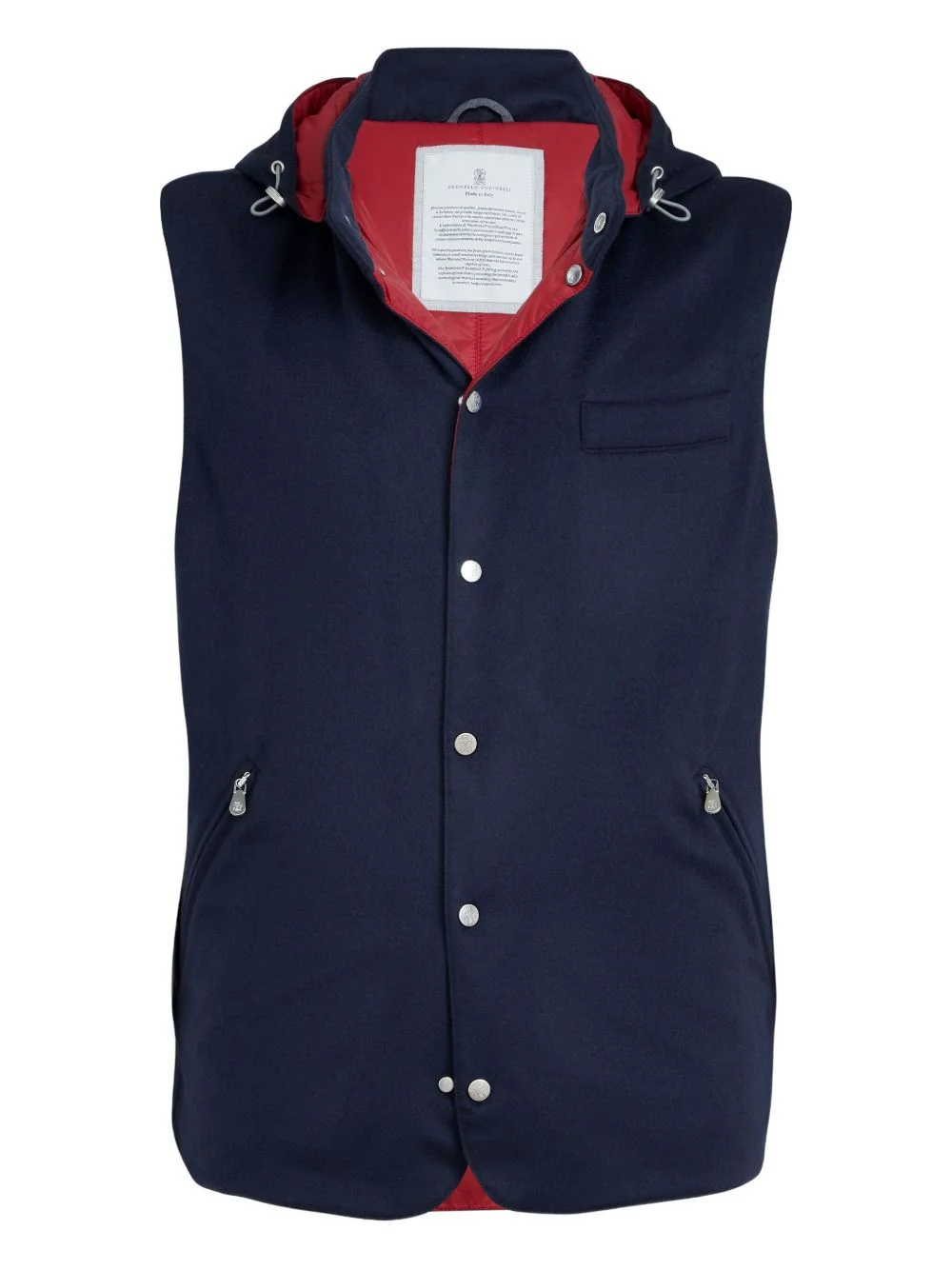 detachable-hood gilet Highlights - Blue - Detachable hood - Chest welt pocket - Front press-stud fastening - Zip pockets Made in Italy Composition Cashmere 100% Washing instructions Specialist Cleaning