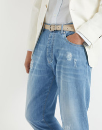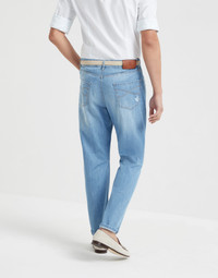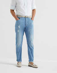 The classic five-pocket trousers are enriched with the excellence of Brunello Cucinelli materials. Cotton denim is an ultra lightweight Japanese fabric that guarantees maximum comfort when worn. Rip details down the leg are made by hand, a sophisticated detail that makes each style unique. The leisure fit offers an ergonomic cut, slightly soft through the seat, but close-fitting down the leg. MATERIALS A garment-dye finishing gives the color a slightly uneven look, particularly along the edges and seams of the garment. DETAILS Metal button closure Front pockets with watch pocket Back patch pockets 18 cm hem Leisure fit: the rise and seat are soft and the proportions of the leg are tapered 100% COTTON