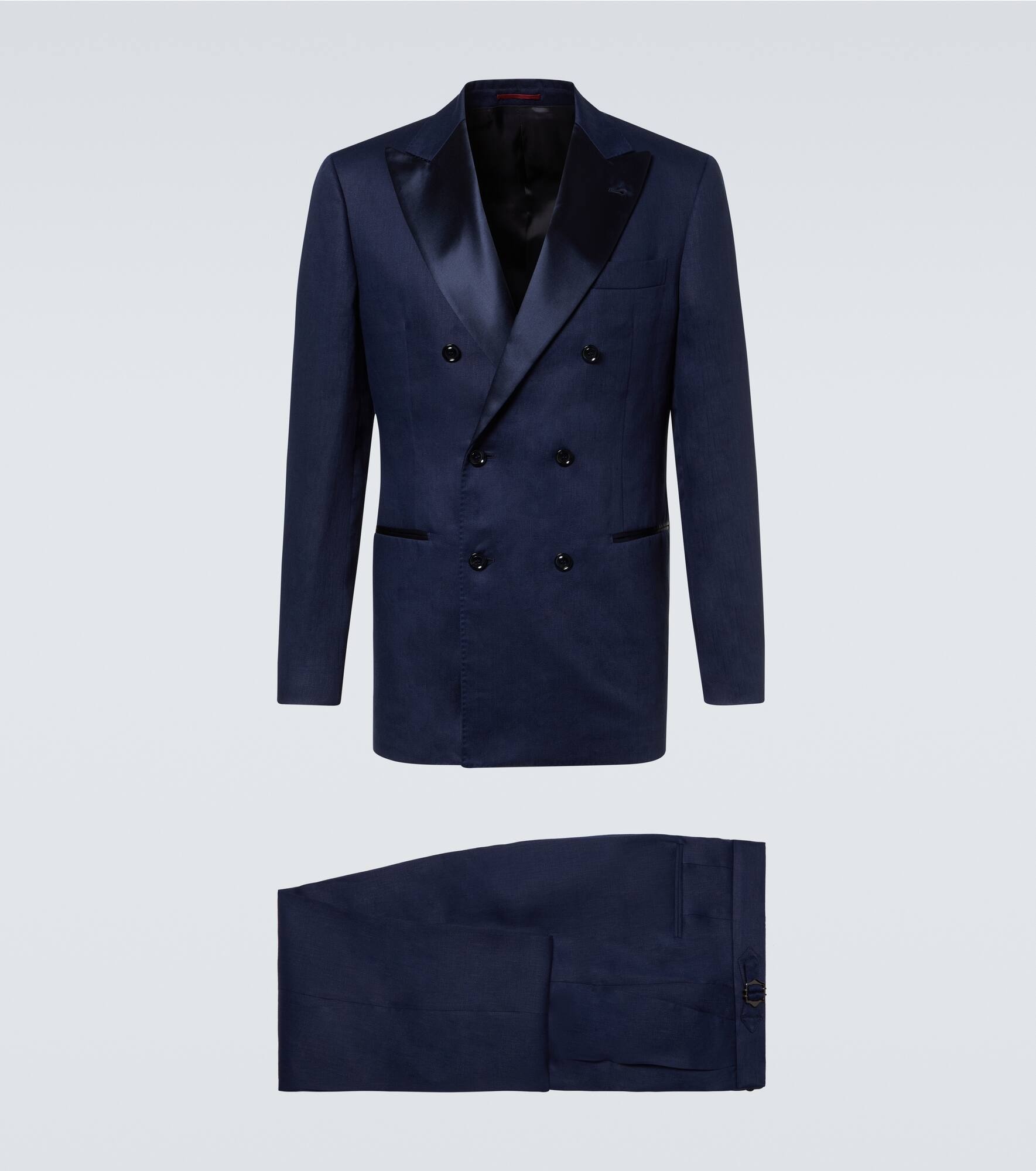 Brunello Cucinelli's designs are created in Solomeo, a medieval hamlet whose art and traditions are woven into the house's every fiber. This double-breasted tuxedo is crafted from linen, ideal for warm-weather events. Product Details - Material: 100% linen - Care instructions: dry clean - Made in Italy - Designer color name: Navy+Blue Colorato - Item color: blue - Trim: 50% cotton, 50% silk - Closure: double-breasted (four buttons) - Cuff: four buttons - Item number: P01006938 Size & Fit - True to size - Slim fit - Non-stretchy fabric - Falls below the hip - Tapered leg - Height of model is 190cm-75" and wears a size IT 50