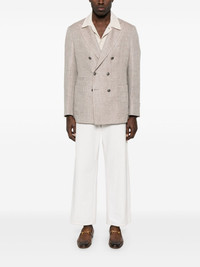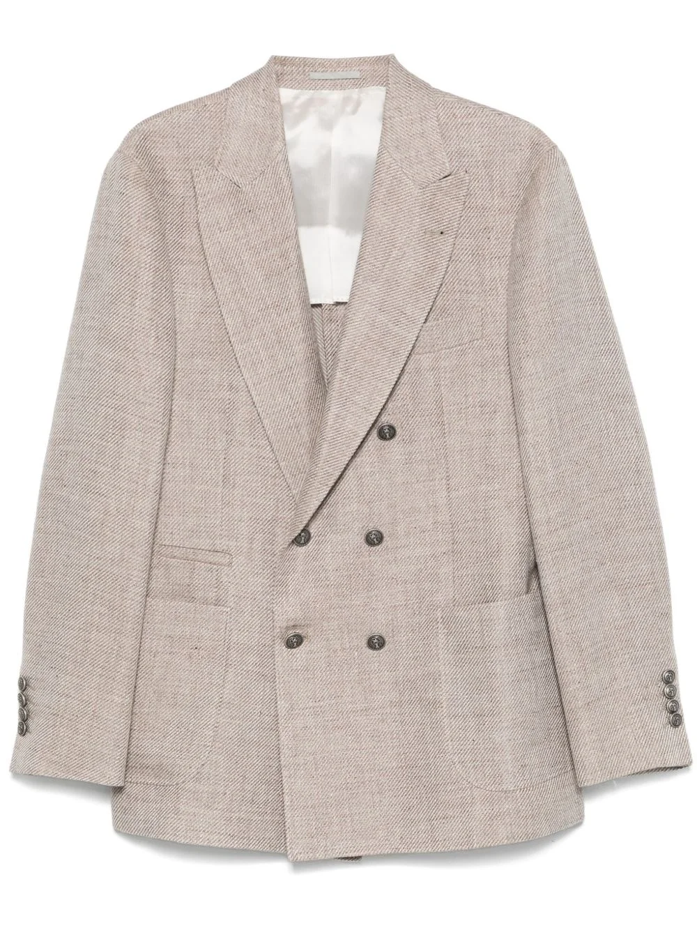 melange-effect blazer Highlights - Sesame beige - Double-breasted button fastening - Chest welt pocket - Two side patch pockets - English rear vents Made in Italy Composition Lining: Cupro 100% Outer: Linen/Flax 67%, Cotton 33% SIZE & FIT Model measurements Height 6 ft 0 in(1.84 m) Bust/Chest 35.82 in(91 cm) Hips 37 in(94 cm) Waist 28.34 in(72 cm) FittingInformation Designed for a slim fit, offering a comfortable fit that sits just away from the body The vented hem offers movement at the rear Made from a midweight non-stretch fabric