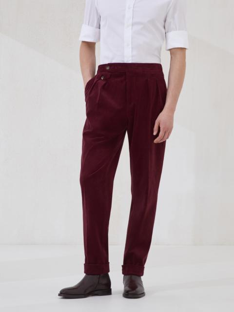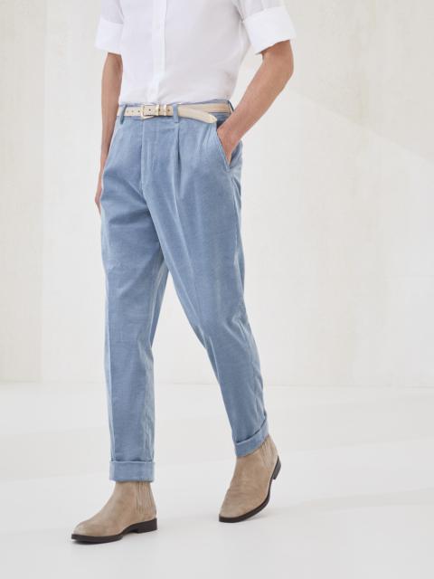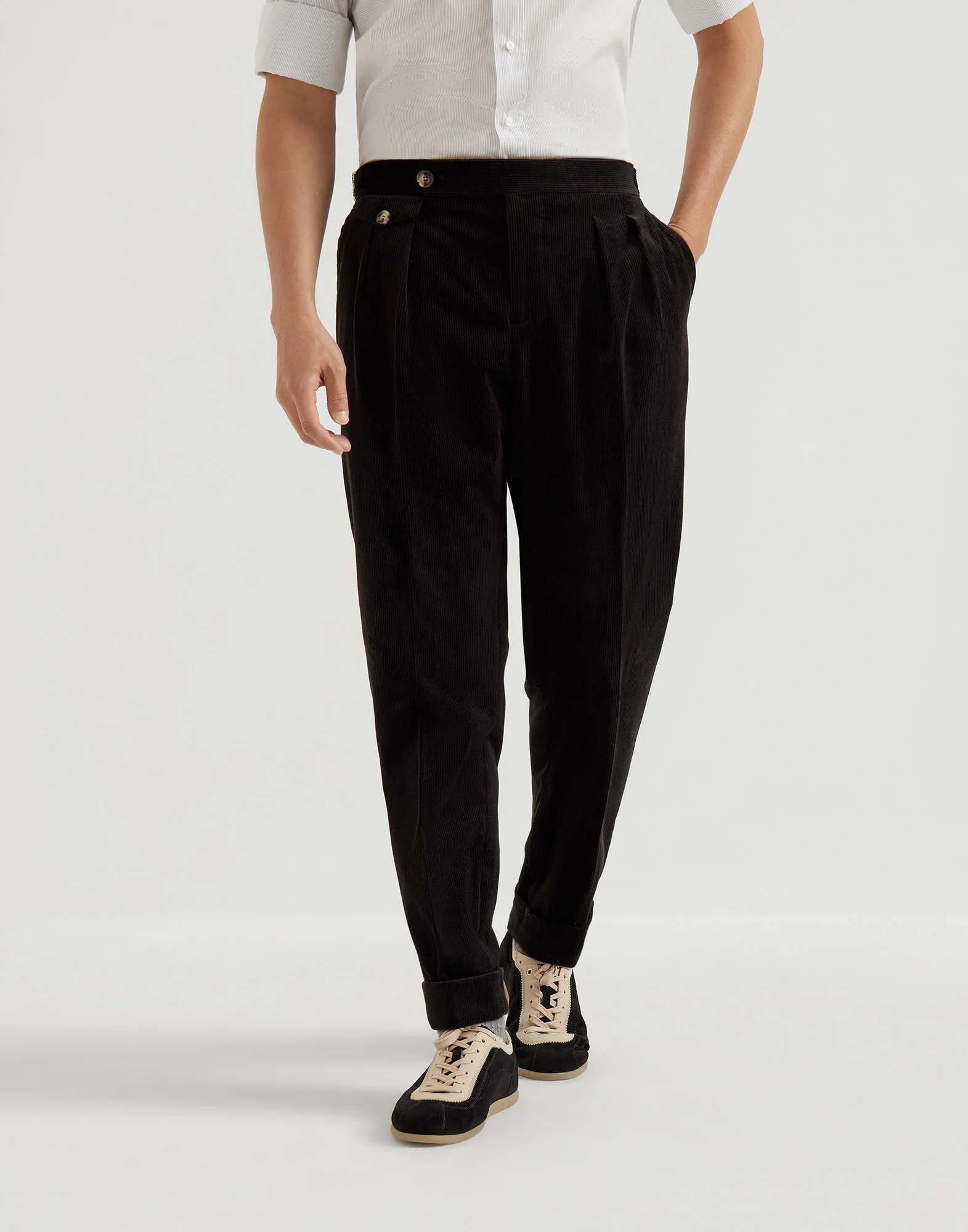 Classic inspirations and contemporary creativity define the refined feel of these traditional-fit trousers with double pleats and side tabs. The fabric’s unmistakable texture comes to life through the seasonal colors and the natural qualities of comfort cotton and cashmere fibers, for an ideal fit. The traditional fit is comfortable and remains close to the body along the leg to accentuate the male physique. MATERIALS Refined cashmere fibers enhance the traditional texture of cotton corduroy, accentuating its softness, warmth and sheen. The presence of an elastic fiber ensures maximum comfort. The knee-length inner lining enriches and complements the garment. DETAILS Zip closure with button, metal hook and backing button Slanted front pockets with watch pocket Double pleat Buckles on the side Back welt pockets with button Cuffed hem Lining to knee 91% COTTON, 8% CASHMERE, 1% ELASTANE
