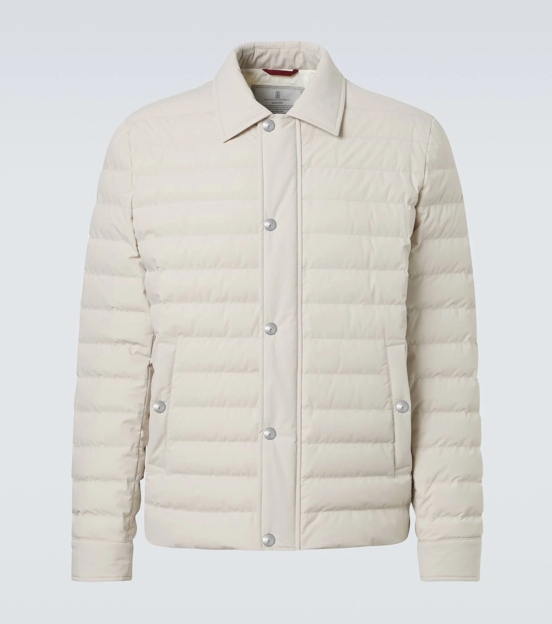 This down jacket from Brunello Cucinelli is crafted with a technical, resistant design, ideal for chilly days. This piece features two side pockets, and the collar and front button fastening create a sophisticated look. Product Details - Material: 87% polyamide, 13% elastane - Care instructions: specialist clean - Made in Italy - Designer color name: Cue79 - Item color: beige - Lining: 100% nylon - Filling: 90% down, 10% feathers - Filling II: 100% polyester - Lining II: 100% polyamide - Contains non-textile parts of animal origin - Includes: garment bag - Item number: P01055981 Size & Fit - True to size - Designed for a loose fit - Non-stretchy fabric - Falls to the hip - Height of model is 189cm-74.5" and wears a size L