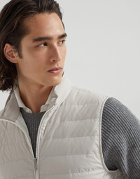 The quality of the materials and skillful techniques enhance the sporty feel of this lightweight zipper down vest. The typical texture of taffeta, smooth and matte-looking, highlights the season's nuances and enriches this quilted outerwear piece, complemented by an inner membrane and a light padding for extra protection. The fit offers straight and regular proportions. MATERIALS Nylon taffeta offers a lightweight, fluid and compact texture with a smooth, semi-matte appearance. The percentage of elastane in the fabric provides added comfort, while the addition of a thin bonded layer enhances protection from the elements without compromising breathability. All of the goose down fill comes exclusively from European suppliers who are members of the EDFA (European Down and Feather Association), which guarantees animal and environmental welfare. DETAILS Two-way zip closure Stand-up collar Hand pockets with zipper Water-resistant nylon lining Internal pocket with zip closure High quality goose down fill 87% NYLON, 13% ELASTANE