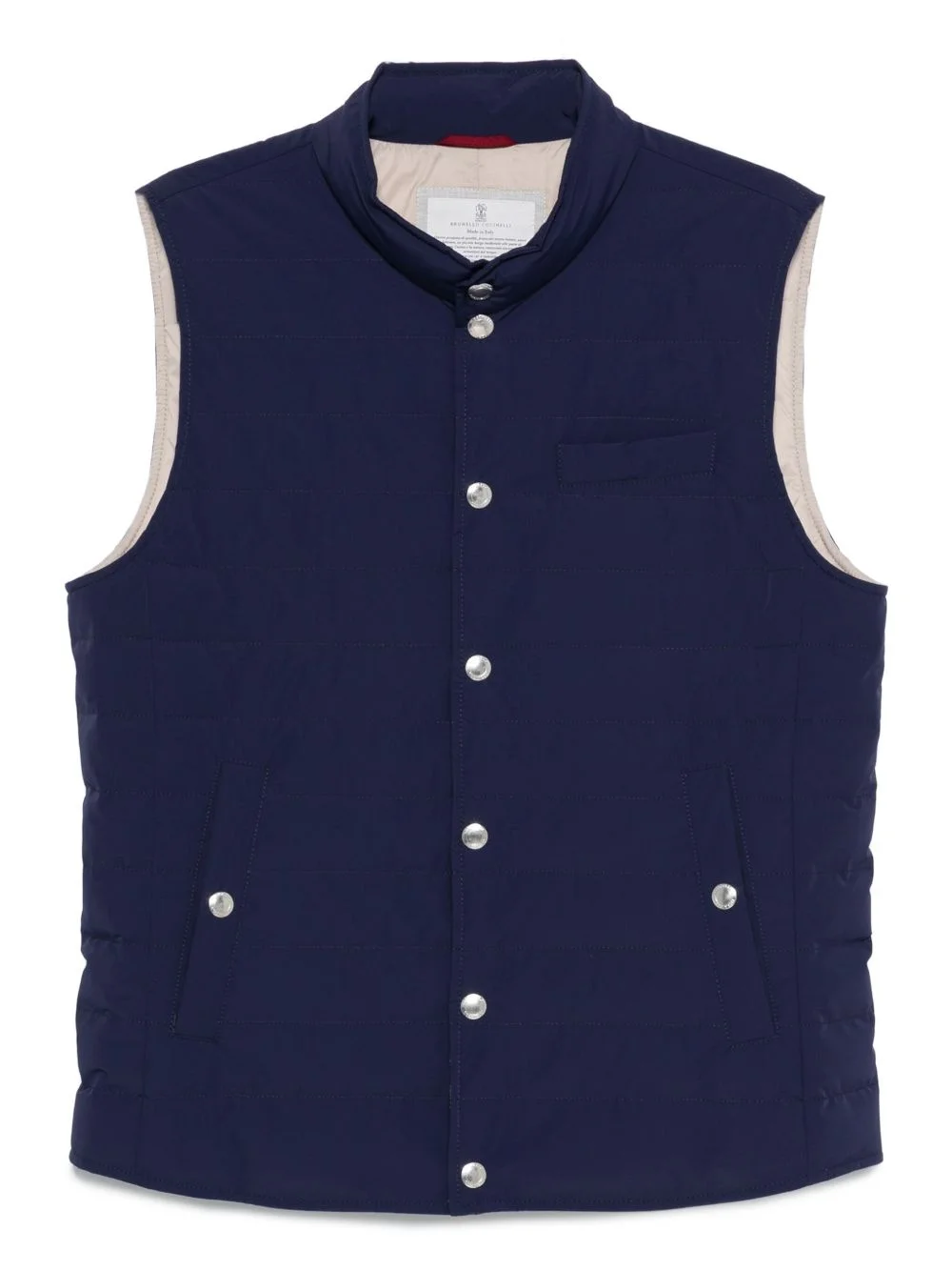 quilted snap-fit fastening vest Highlights - Navy blue - Quilted design - Snap-fit fastening - Sleeveless - High neck - Welt pockets Made in Italy Composition Outer: Polyamide 87%, Elastane 13% Lining: Nylon 100%, Polyamide 100%, Goose Down 90%, Goose Feather 10% SIZE & FIT Model measurements Height 6 ft 2 in(1.88 m) Bust/Chest 37.4 in(95 cm) Hips 38.58 in(98 cm) Waist 31.1 in(79 cm) Washing instructions Dry Clean Only