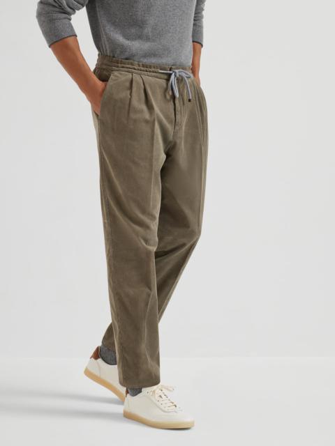 The casual feel of these drawstring trousers is enriched by the excellence of Brunello Cucinelli’s craftsmanship. The sartorial detail of the pleats creates a harmonious contrast with the corduroy fabric, garment-dyed for a distinct color effect. The modern leisure fit offers soft proportions in the seat and a slight low-rise, while the cut of the leg remains close to the body. MATERIALS Fine wale pure cotton corduroy flaunts a thin ribbed texture combining retro inspirations with a casual feel. Garment-dyeing lends a slightly irregular “worn” effect that enhances the refined seasonal colors. DETAILS Elastic waistband with drawstring Slanted front pockets Back welt pockets Plain hem 100% COTTON