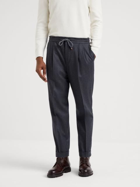 The casual feel of these drawstring trousers is enriched by the excellence of Brunello Cucinelli’s craftsmanship. The flannel’s diagonal pattern and the double pleats on the front convey the garment’s tailored inspiration. The modern leisure fit offers soft proportions in the seat and a slight low-rise, while the cut of the leg remains close to the body. MATERIALS The soft, lightweight pure wool flannel enhances the noble qualities of the natural fiber, while the twill weave showcases the fabric’s characteristic diagonal texture. The knee-length lining provides added comfort. DETAILS Zipper closure with metal hook, inner-button and drawstring Slanted front pockets Double pleat Back welt pockets Plain hem Lining to knee Leisure fit: the rise and seat are soft and the proportions of the leg are tapered 100% VIRGIN WOOL