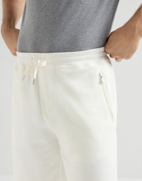 Refined materials enrich the sporty style of the Travelwear line, dedicated to moments of relaxation and leisure. These Bermuda shorts with an elasticized waist and drawstring showcase a soft, relaxed silhouette and are delivered in techno cotton French terry, enriched by its distinctive texture contrast: smooth and compact on the outside and soft on the inside against the skin. The design, completed with zipper pockets in the front, features regular volume that makes it comfortable and versatile. MATERIALS Techno cotton French terry is a soft, lightweight fabric: the exterior texture is smooth and compact, while the reverse side offers a honeycomb structure which helps to make it lightweight to wear. A small percentage of synthetic fiber provides added comfort. DETAILS Rib knit waistband with drawstring Front pockets with zipper Back patch pockets with button Plain hem 95% COTTON, 5% NYLON