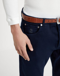 Garment-dyed comfort denim leisure fit five-pocket trousers