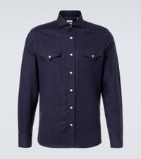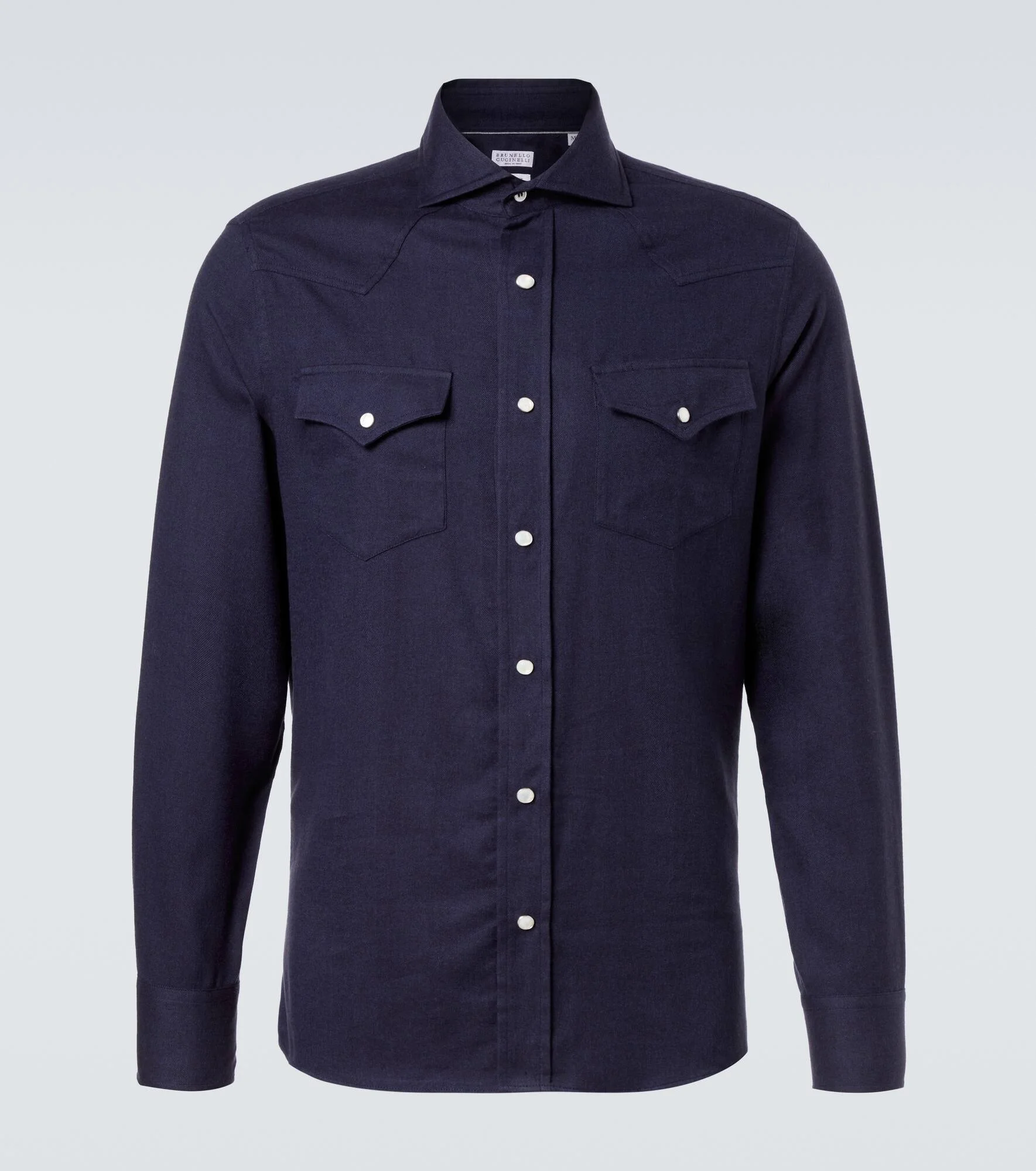 Brunello Cucinelli's designs are created in Solomeo, a medieval hamlet whose art and traditions are woven into the house's every fiber. Crafted from cotton-blend flannel, this shirt features a tonal chevron pattern with chest pockets and snap-buttoned front closure. Product Details - Material: 59% cotton, 41% lyocell - Care instructions: hand wash - Made in Italy - Designer color name: C019 - Item color: blue - Material II: 100% cotton - Contains non-textile parts of animal origin - Collar: spread - Closure: snap-buttoned front - Pockets: angled chest pockets - Cuff: buttoned - Item number: P01056032 Size & Fit - True to size - Without pleats in the back - Regular fit - Non-stretchy fabric - Height of model is 188cm-74" and wears a size M