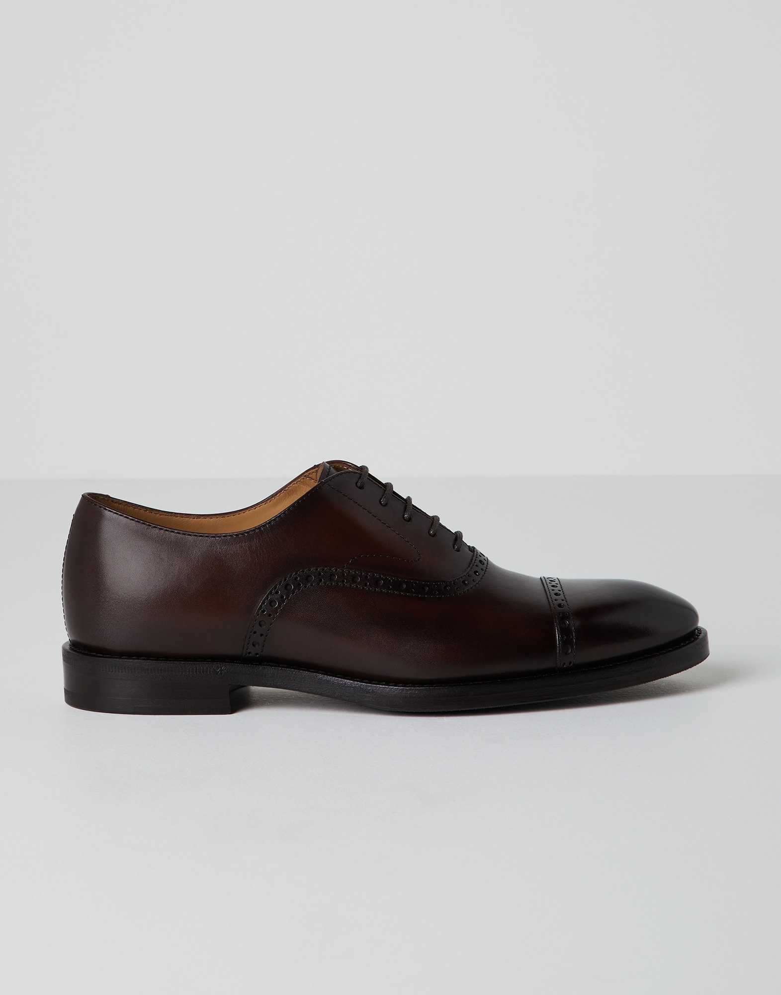 Refined, elegant materials enhance the timeless style of these Oxford Brogues. The smooth, matte and even appearance of Elegant calfskin is paired with a traditional geometric perforation that runs along the edges of the seams. The thin leather and lightweight rubber bottom goes perfectly with the sleek and sophisticated lines of this footwear. MATERIALS Refined Elegant calfskin is characterized by a very smooth, matte texture that barely shows a grain. The drum dyeing creates an extremely subtle light and dark effect that enhances the color. A leather lining provides added comfort. DETAILS Thin fabric laces Leather lining Sole in leather and lightweight expanded polyurethane REAL LEATHER