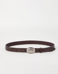 Retro inspiration and artisanal workmanship come together in this calfskin belt with leaf motif pattern: the botanical embellishment is showcased delicately in relief, enriching the leather’s polished texture. The metal buckle features a woven pattern that completes the style of the casual accessory. MATERIALS Smooth and firm, the refined calfskin leather is brought to life with a delicate leaf print that stands out on the leather's glossy surface. DETAILS Belt height approx. 2.5 cm (0.98") All metal parts are Nickel-free REAL LEATHER